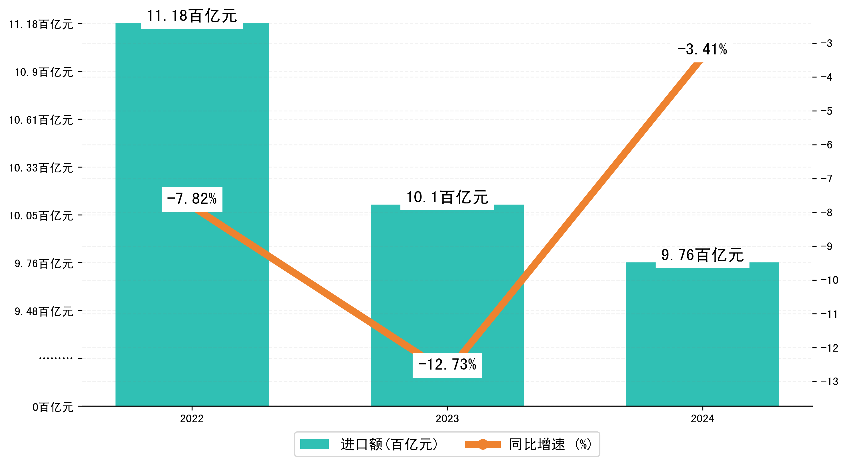 以人民币计,2024年1-10月合肥市进口额为976,0738.0708万元,相比上年同期减少了34,4069.122万元,同比减少了-3.40%。