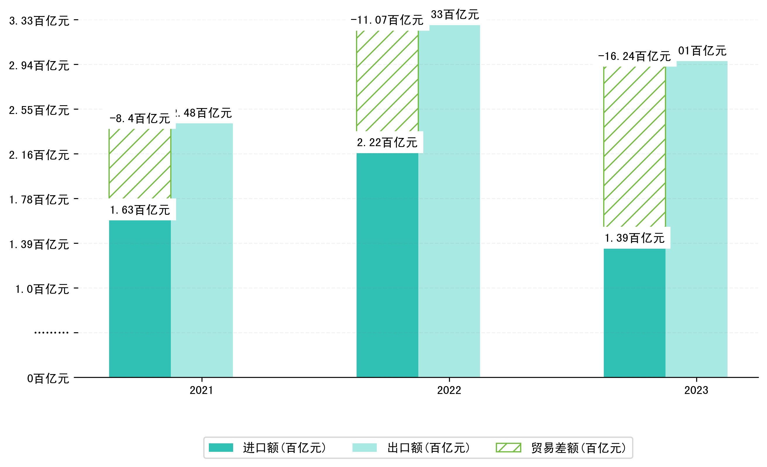 以人民币计,2023年1-2月合肥市贸易差额为162,4103,2917万元(贸易顺差),相比上年同期增加了51,6673,4825万元,同比增加46.66%。