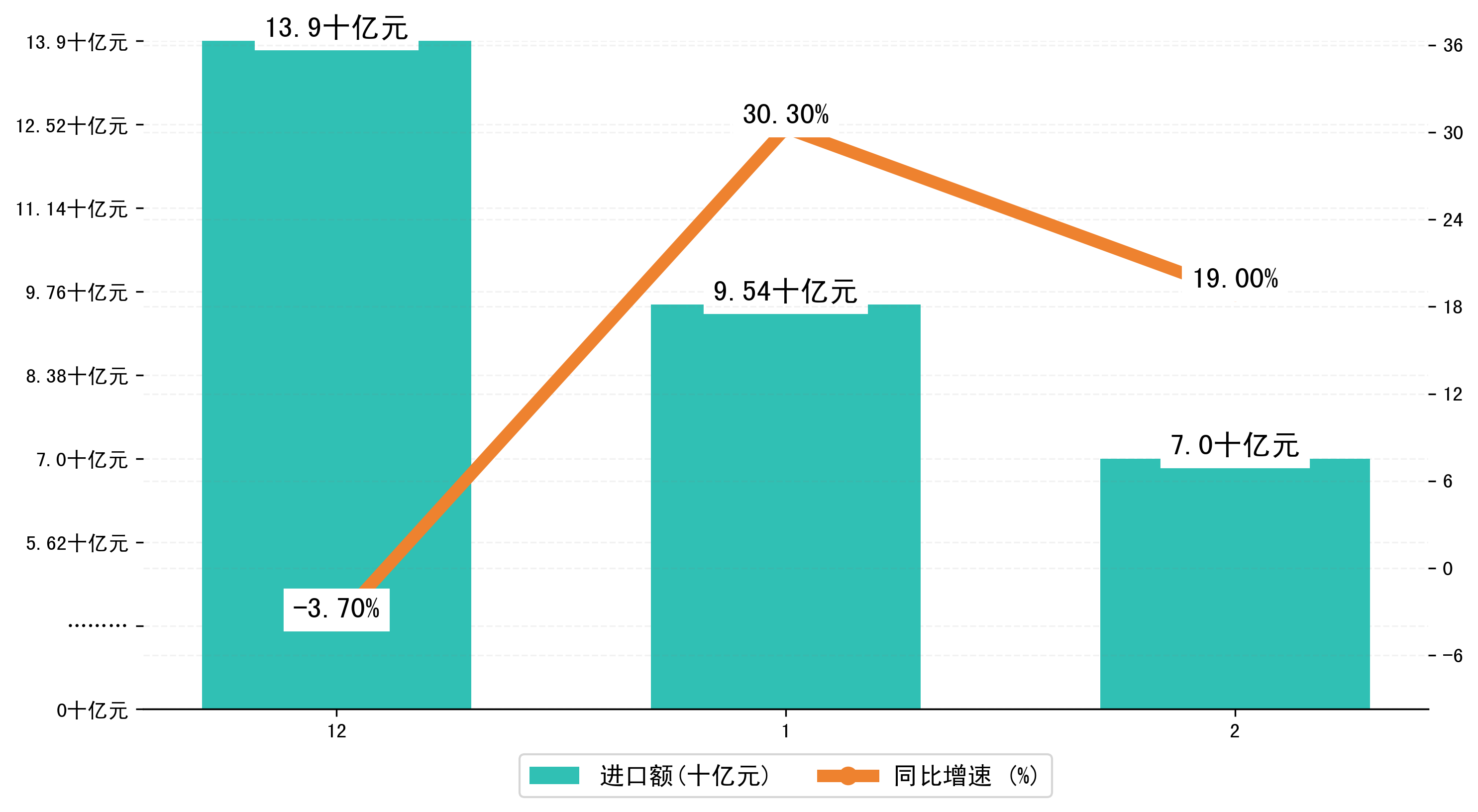 以人民币计,2024年2月合肥市进口额为70,0072.2712万元,相比上月减少了25,4427.0439万元;相比上年同期增加了4,2732.9359万元,同比增加了19.00%。