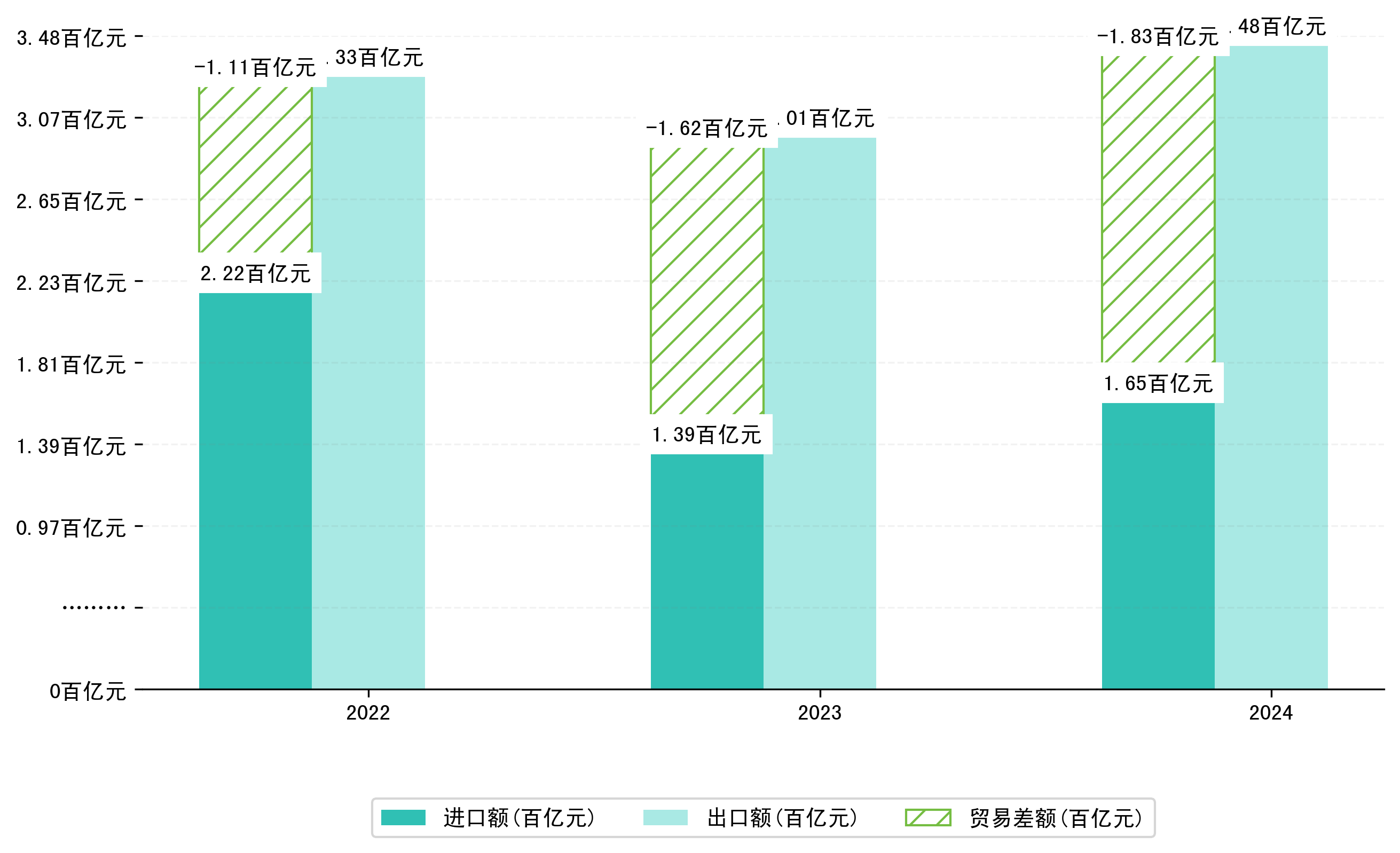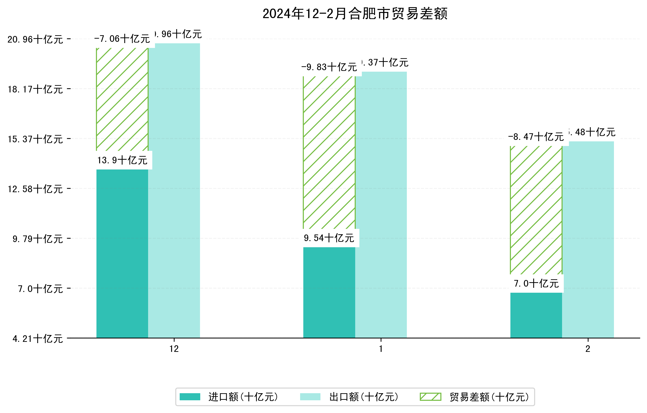 以人民币计,2024年1-2月合肥市贸易差额为183,0305,2564万元(贸易顺差),相比上年同期增加了20,6201,9647万元,同比增加12.7%。