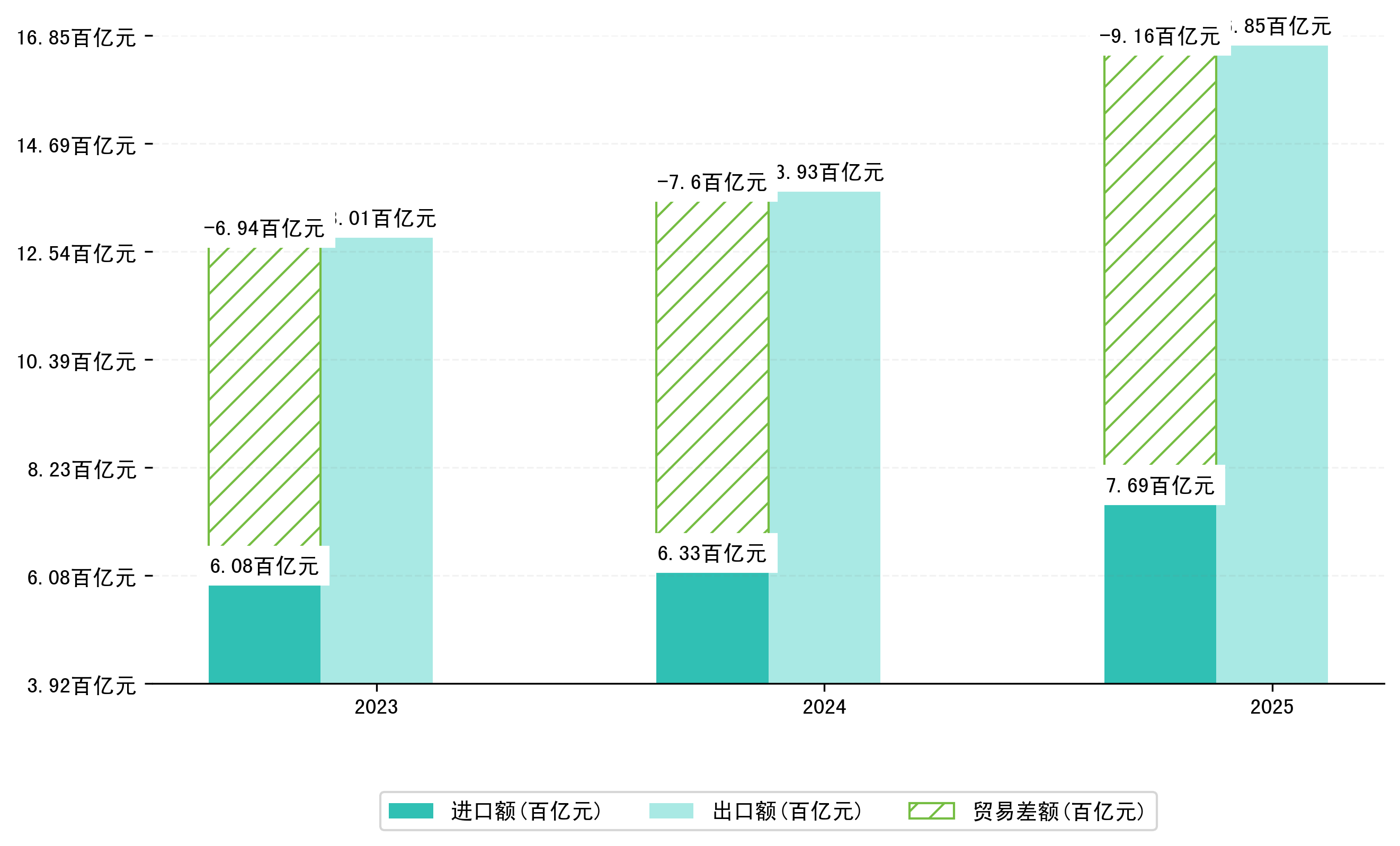 以美元计,2025年7月合肥市贸易差额为17,1328,5422万美元(贸易顺差),相比上月减少了4,8765,9141万美元;相比上年同期增加了2,7842,9197万美元,同比增加19.4%。