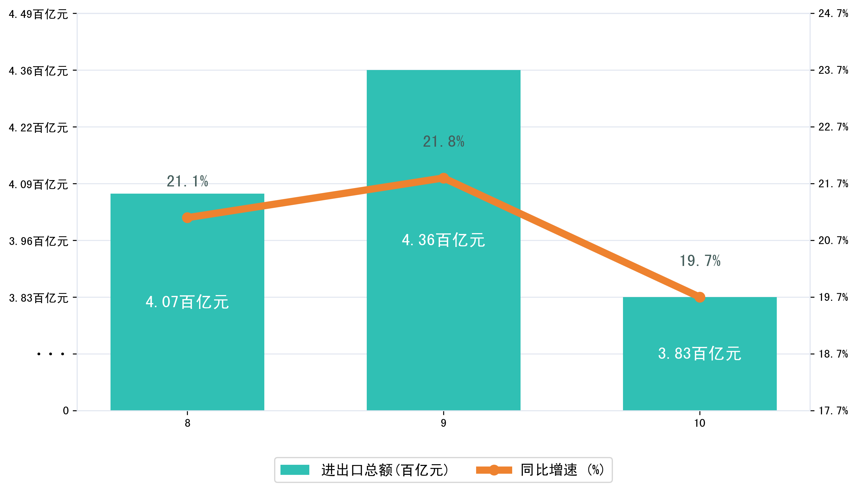 以人民币计,2025年1-10月合肥市进出口总额为3678,6901.1249万元,相比上年同期增加了606,7855.3215万元,同比增加了19.70%。