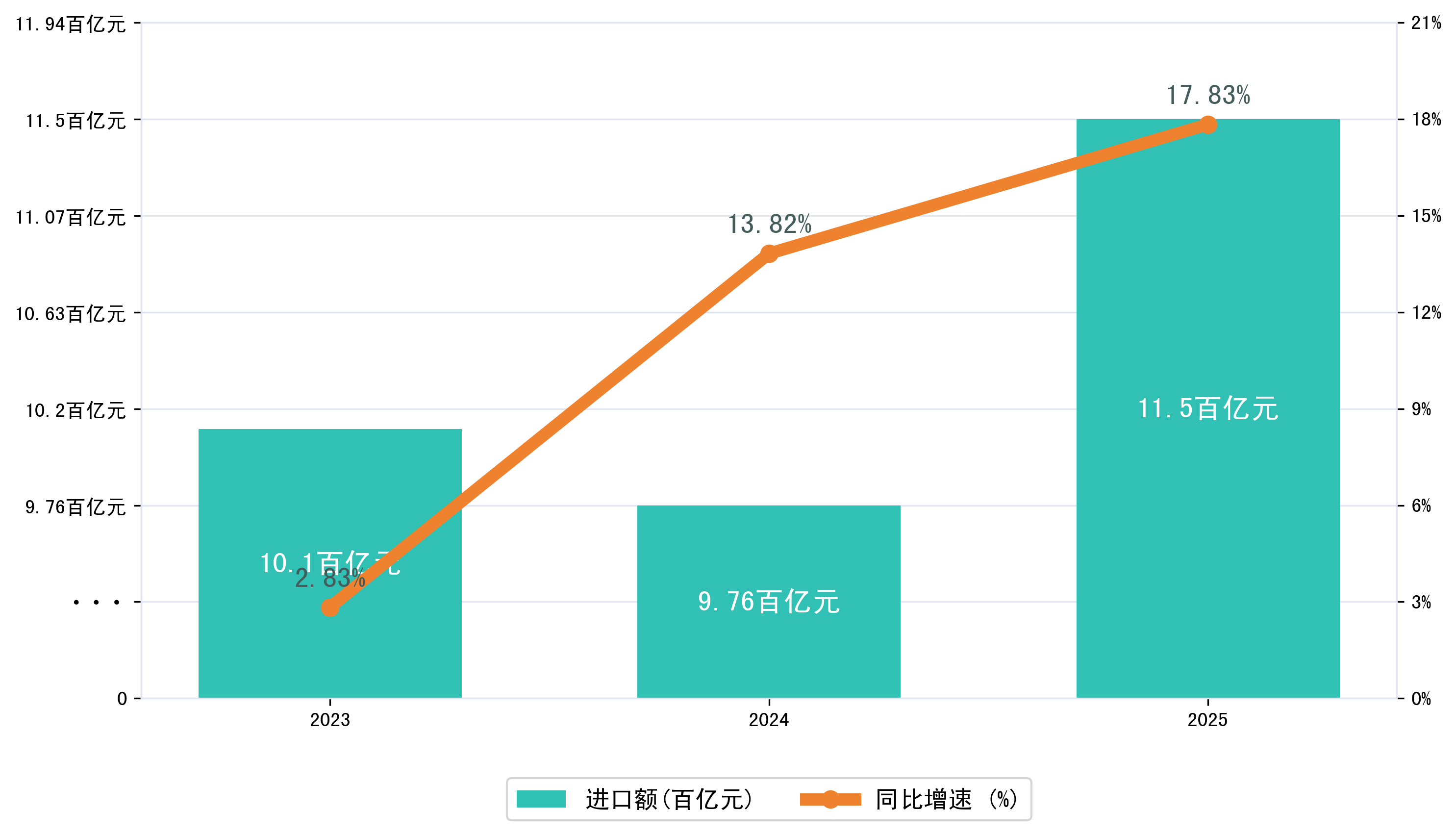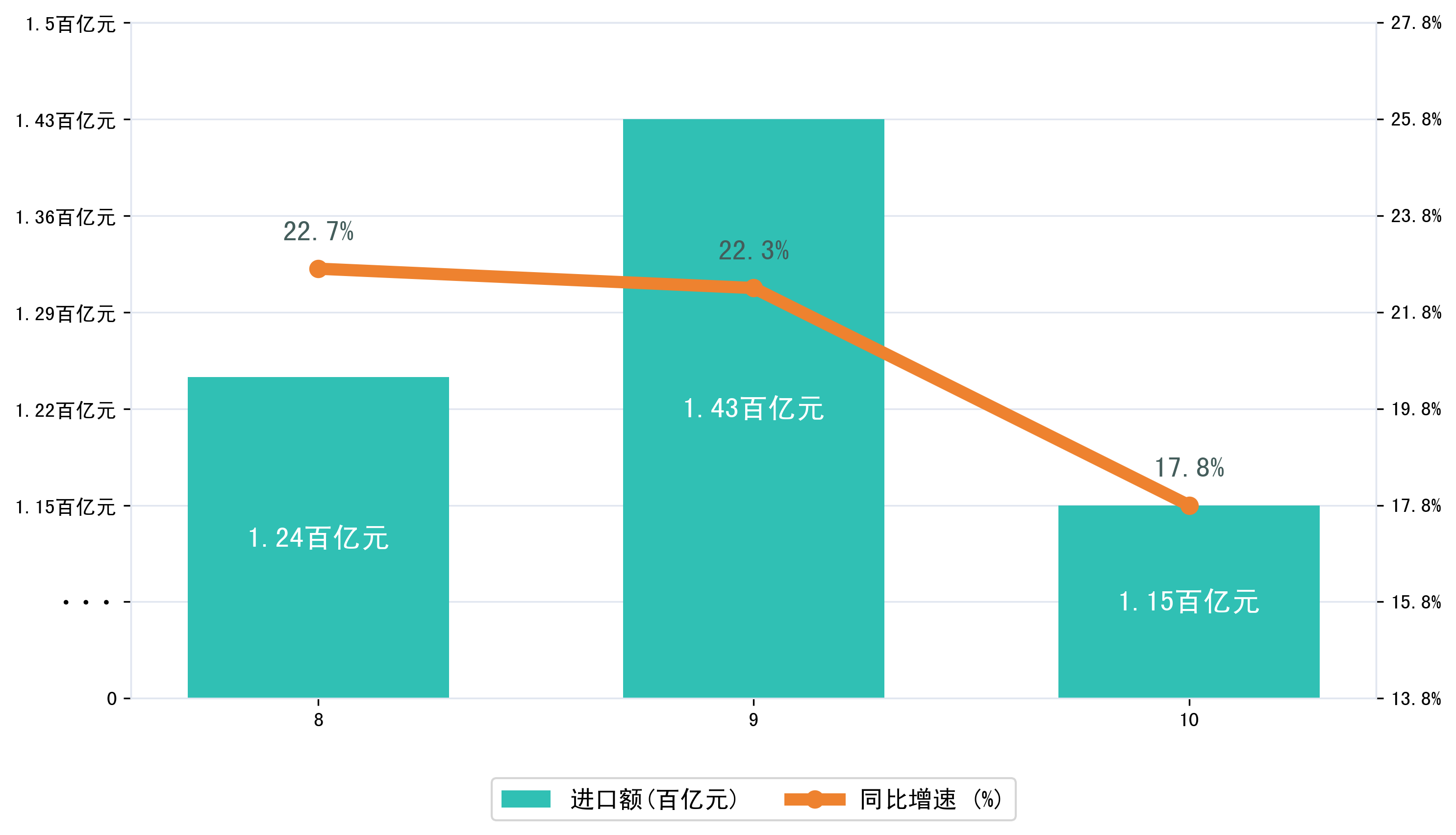 以人民币计,2025年1-10月合肥市进口额为1150,0848.5602万元,相比上年同期增加了174,0110.4894万元,同比增加了17.80%。