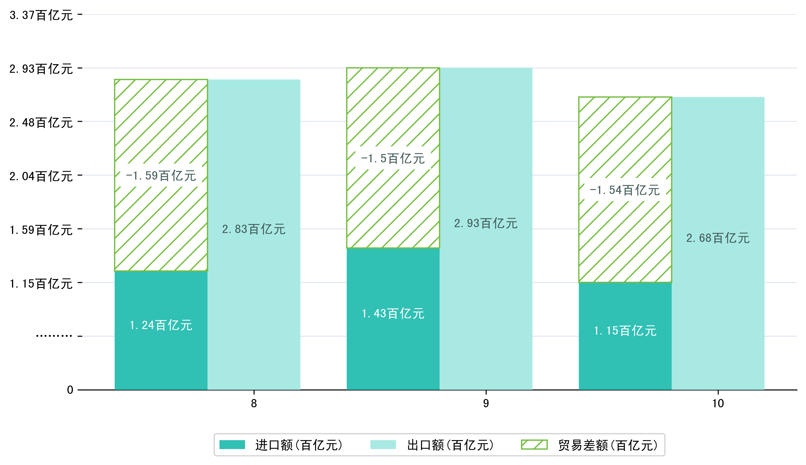 以人民币计,2025年10月合肥市贸易差额为153,8613,1472万元(贸易顺差),相比上月增加了4,1913,8678万元,即6560,8437万美元;相比上年同期增加了47,3329,7438万元,同比增加44.43%。