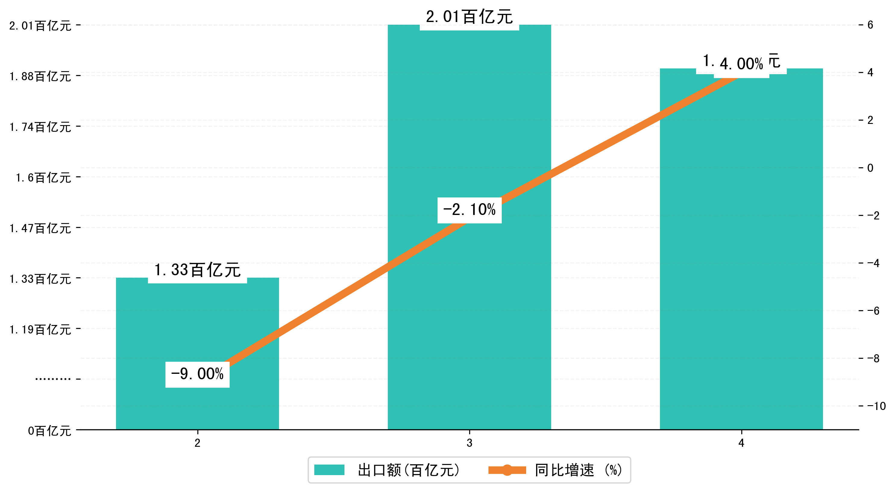以美元计,2023年1-4月合肥市出口额为100,8643.9197万美元,相比上年同期增加了3,9223.9646万美元,同比增加-3.50%。