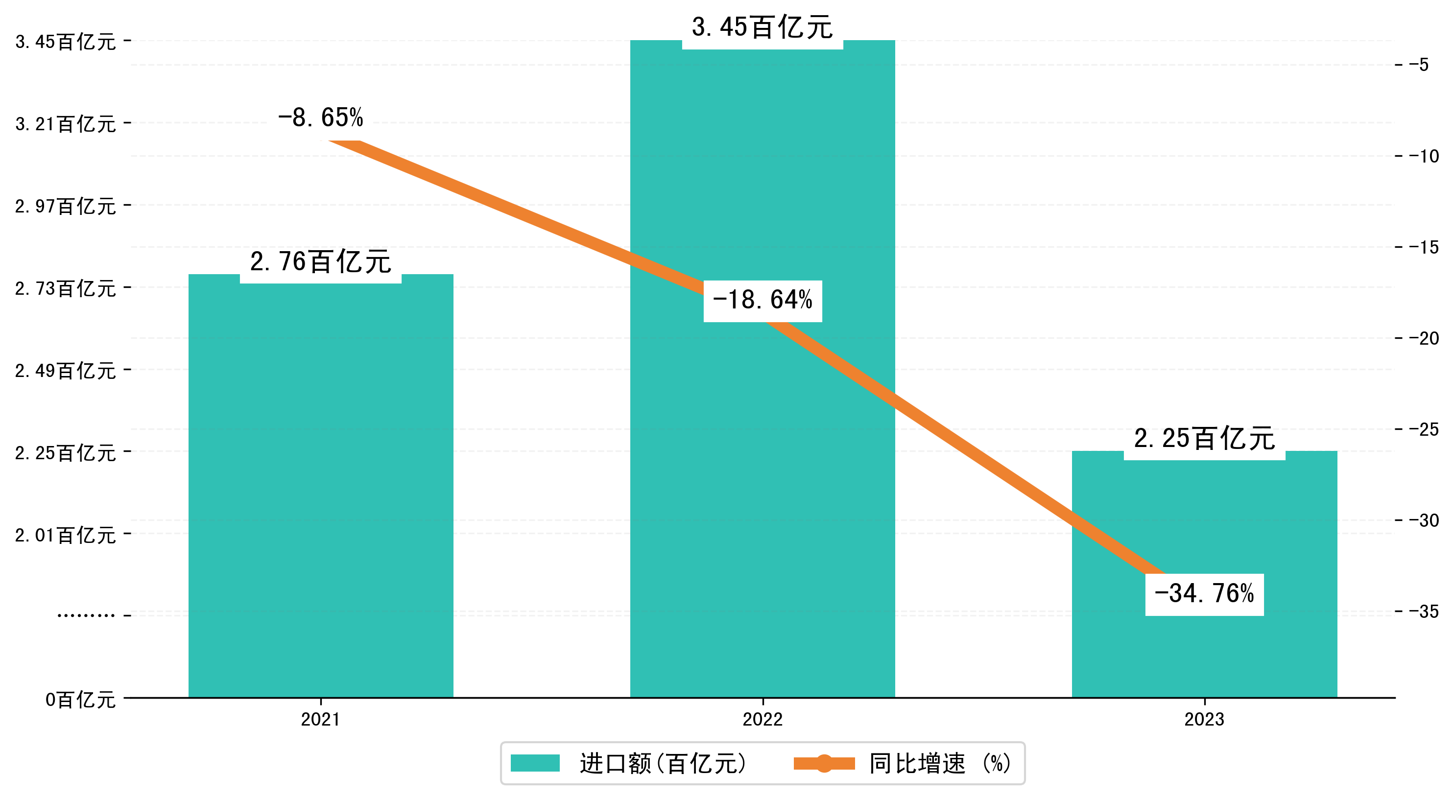 以人民币计,2023年1-3月合肥市进口额为224,8331.8536万元,相比上年同期减少了119,7738.7433万元,同比减少了-34.80%。