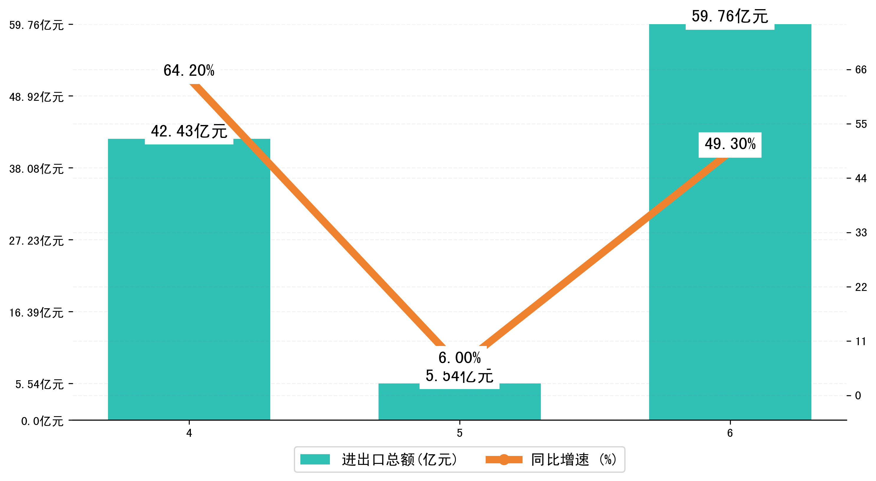 以人民币计,2024年6月黑河市进出口总额为59,7644.5524万元,相比上月增加了54,2197.8646万元;相比上年同期增加了51,2882.1508万元,同比增加了49.30%。