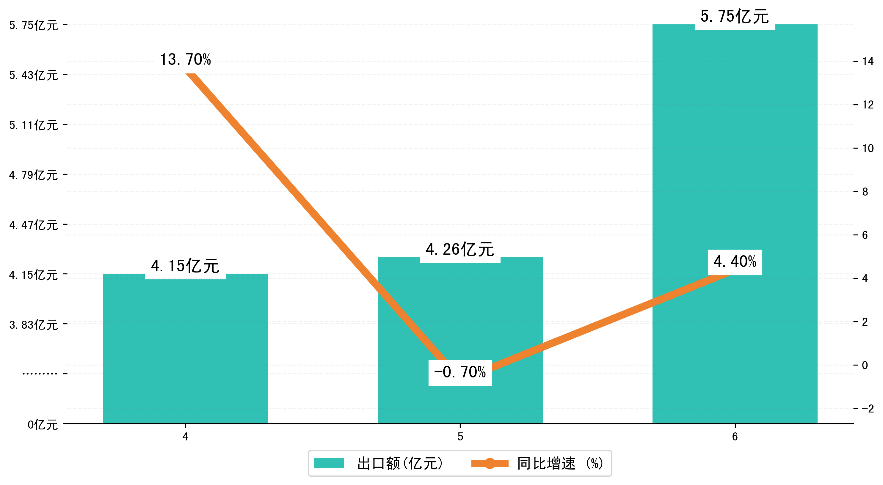 以美元计,2024年1-6月黑河市出口额为3,7178.3193万美元,相比上年同期增加了637.9369万美元,同比增加1.80%。