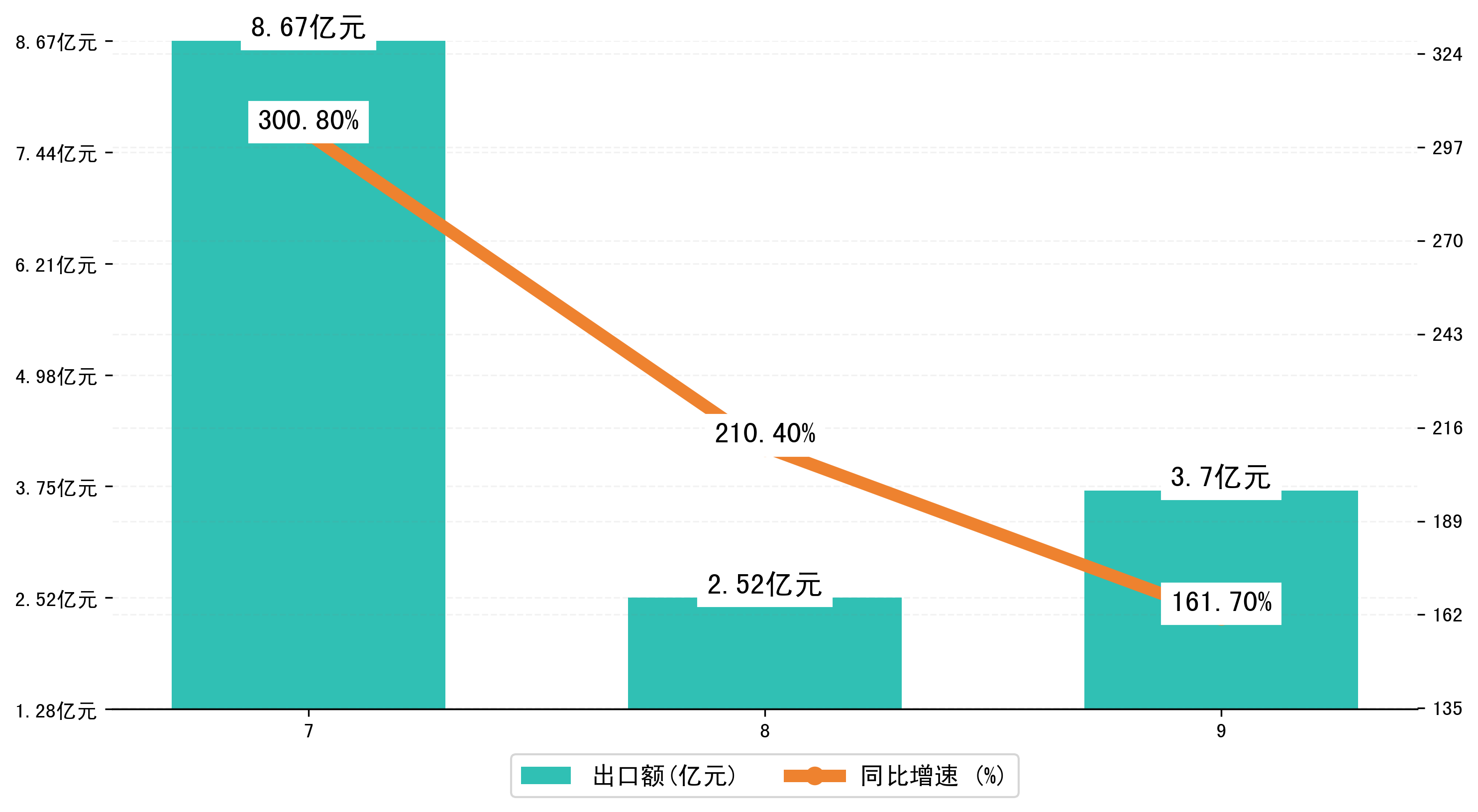 以美元计,2023年1-9月黑河市出口额为5,7253.606万美元,相比上年同期增加了3,4282.7438万美元,同比增加149.80%。