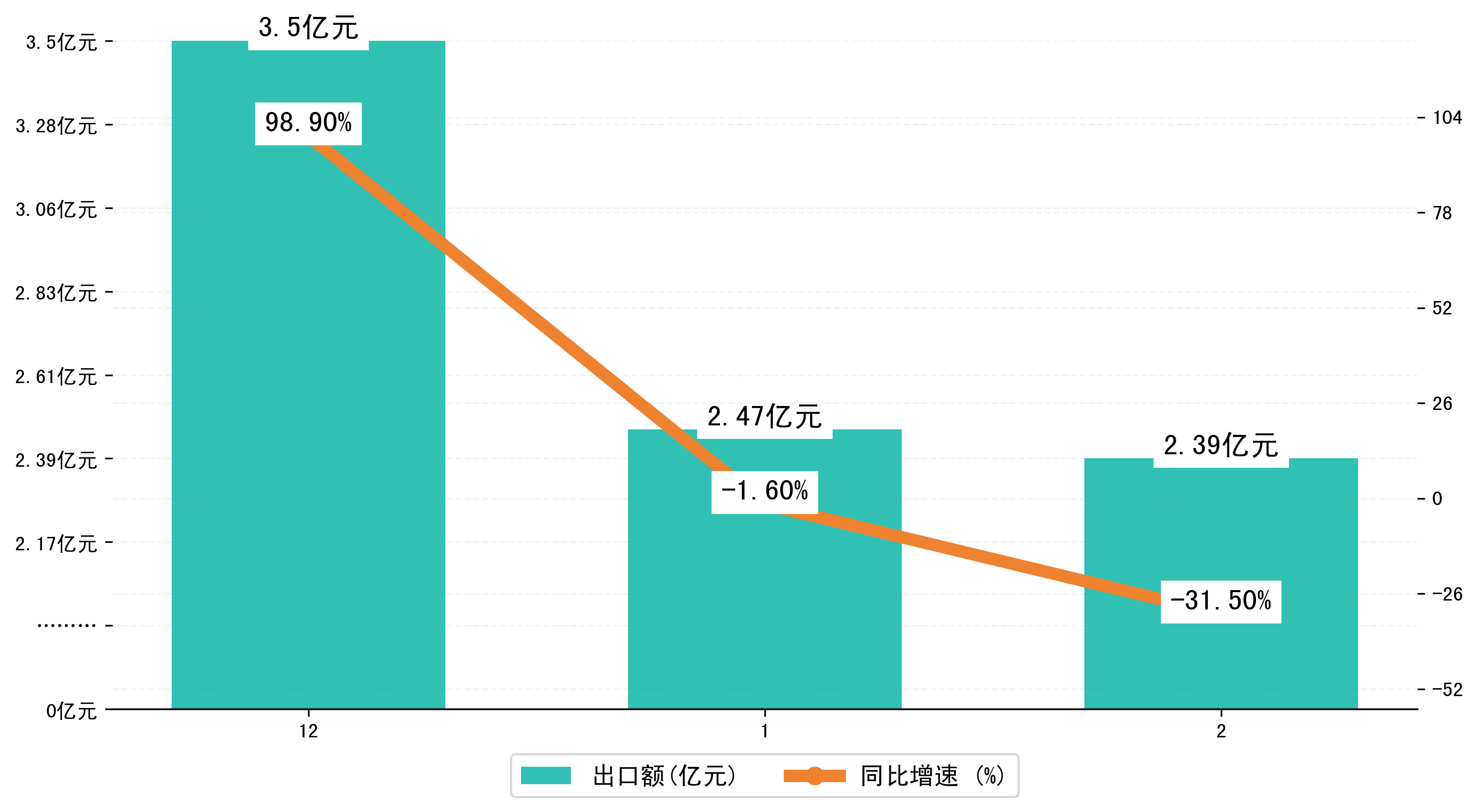 以人民币计,2024年2月黑河市出口额为2,3922.369万元,相比上月减少了768.0144万元;相比上年同期减少了2,1834.2523万元,同比减少了-31.50%。