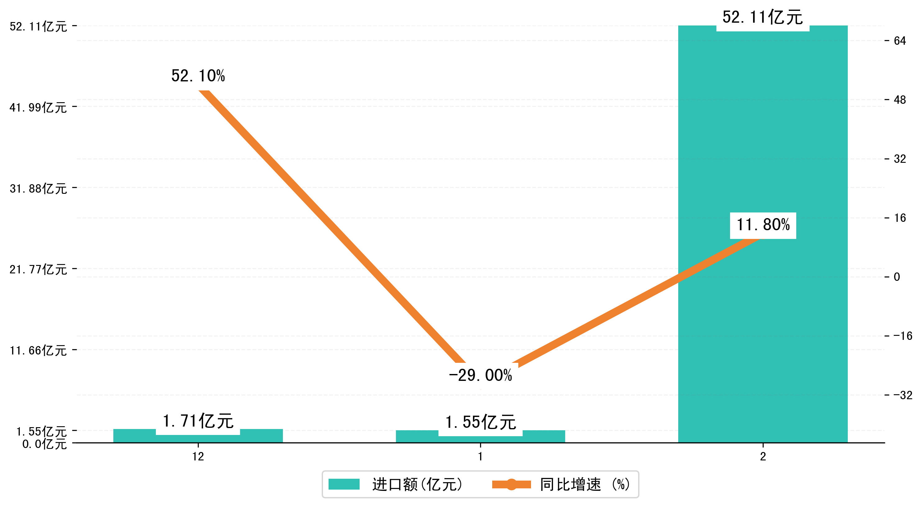 以美元计,2024年1-2月黑河市进口额为7,5408.6597万美元,相比上年同期增加了4547.727万美元,同比增加6.40%。