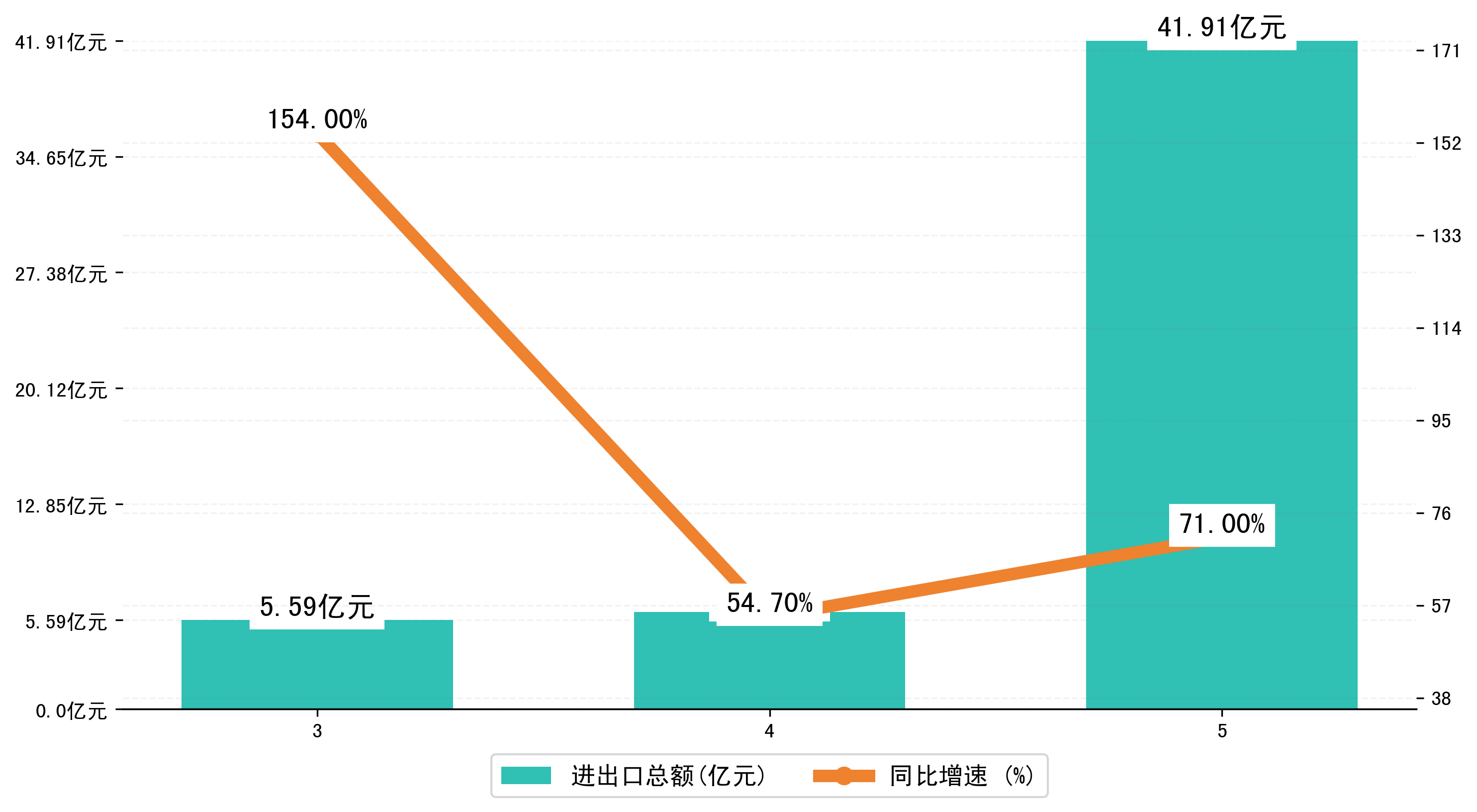 以人民币计,2023年5月黑河市进出口总额为41,9109.4894万元,相比上月增加了35,8110.8977万元;相比上年同期增加了21,5081.1001万元,同比增加了71.00%。