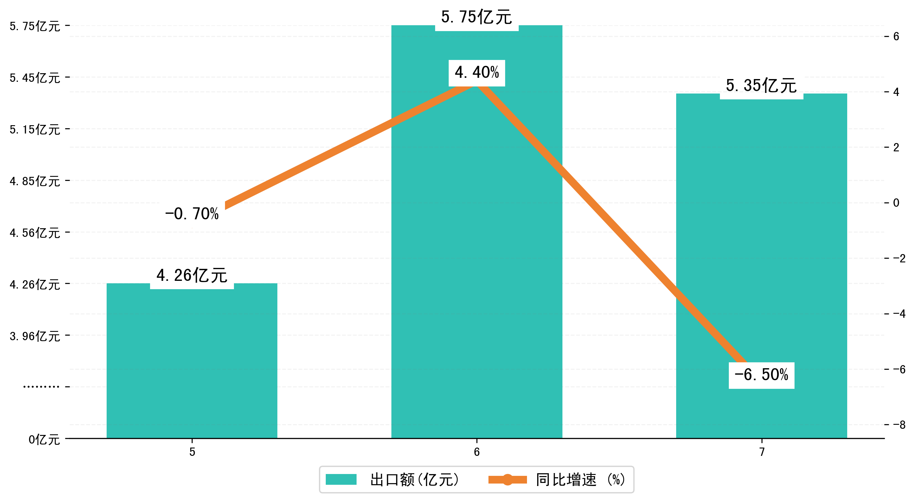 以人民币计,2024年7月黑河市出口额为5,3528.0112万元,相比上月减少了3941.1229万元;相比上年同期减少了3,3203.0935万元,同比减少了-6.50%。