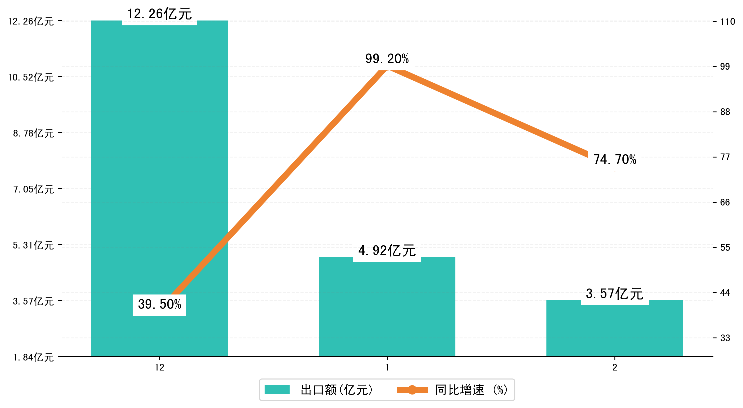 以人民币计,2025年1-2月黑河市出口额为8,4919.2648万元,相比上年同期增加了3,6306.5124万元,同比增加了74.70%。