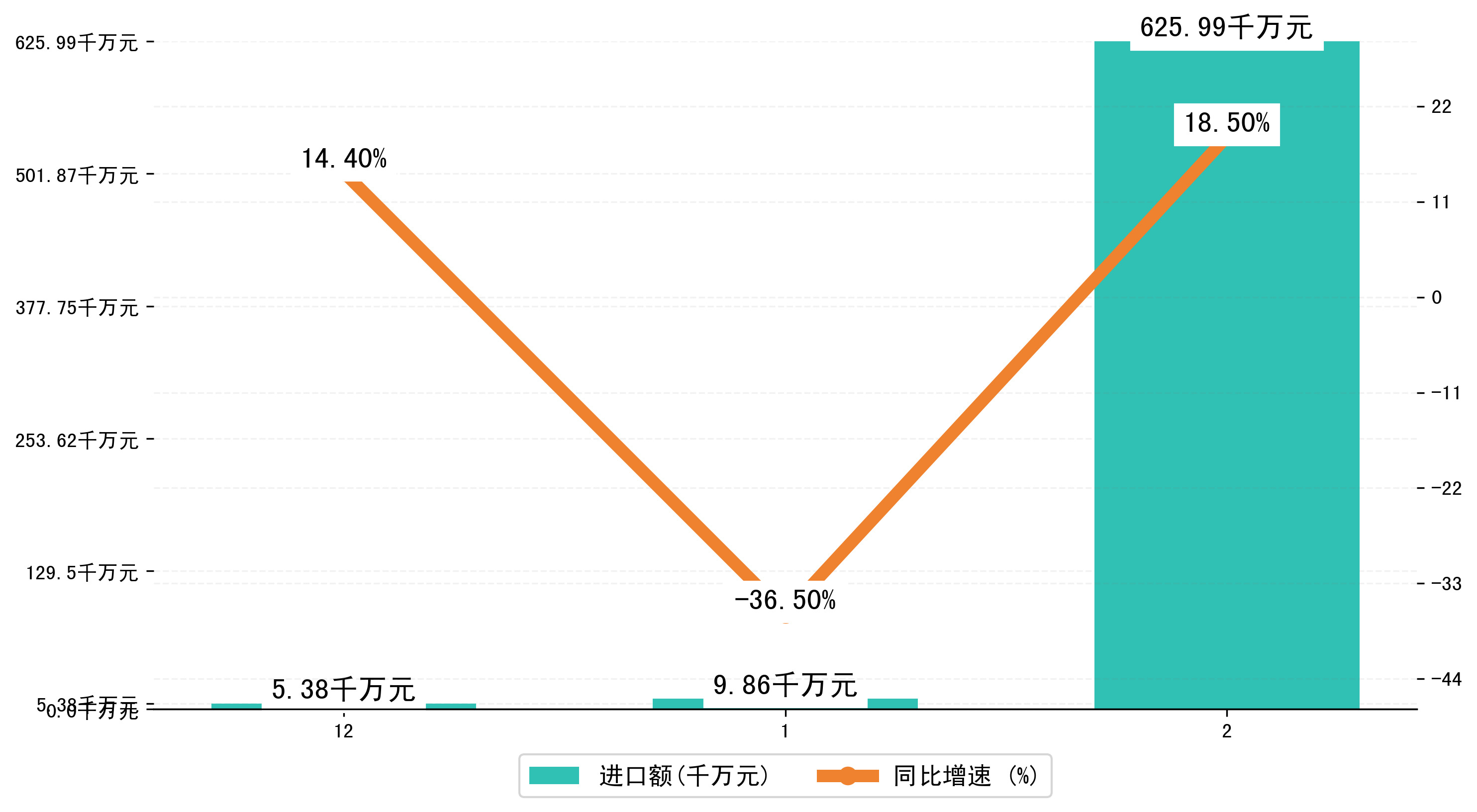 以人民币计,2025年1-2月黑河市进口额为63,5852.0697万元,相比上年同期增加了9,9277.0927万元,同比增加了18.50%。
