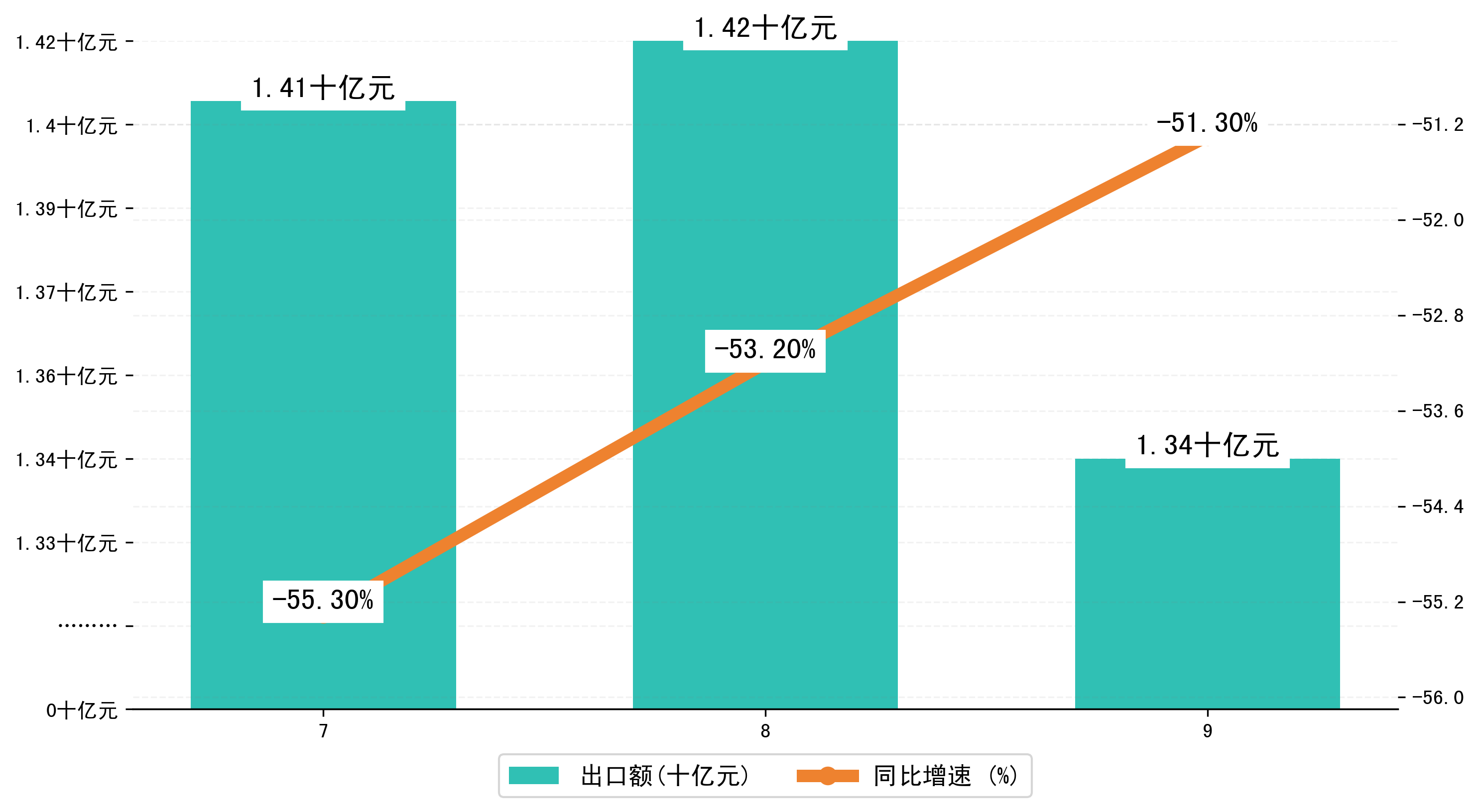 以美元计,2024年1-9月衡阳市出口额为16,4521.8183万美元,相比上年同期减少了18,3514.9796万美元,同比减少-52.40%。