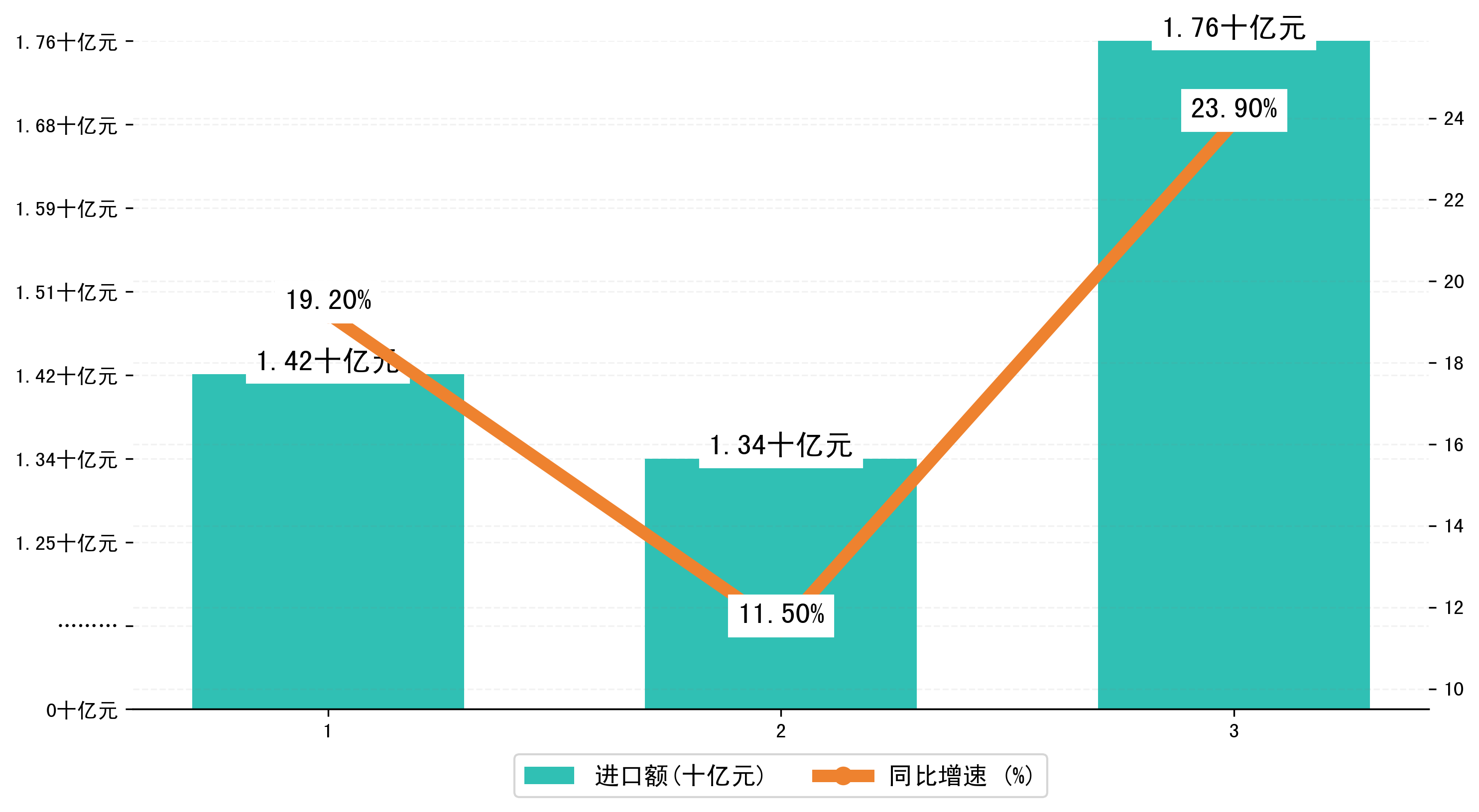 以美元计,2024年1-3月衡阳市进口额为6,3592.4697万美元,相比上年同期增加了1,1231.2943万美元,同比增加20.20%。