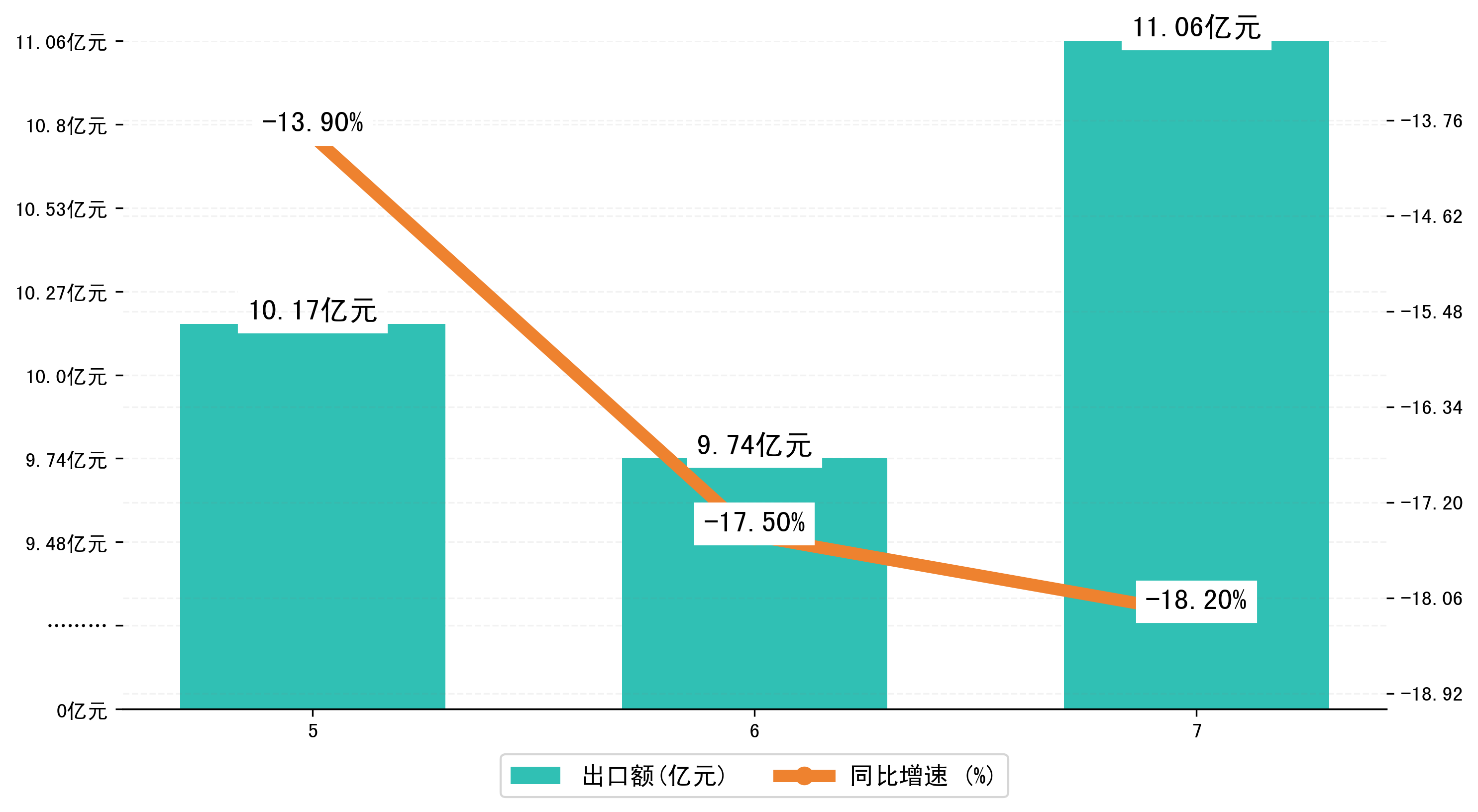 以美元计,2025年1-7月衡阳市出口额为10,1826.8176万美元,相比上年同期减少了2,3985.001万美元,同比减少-19.00%。