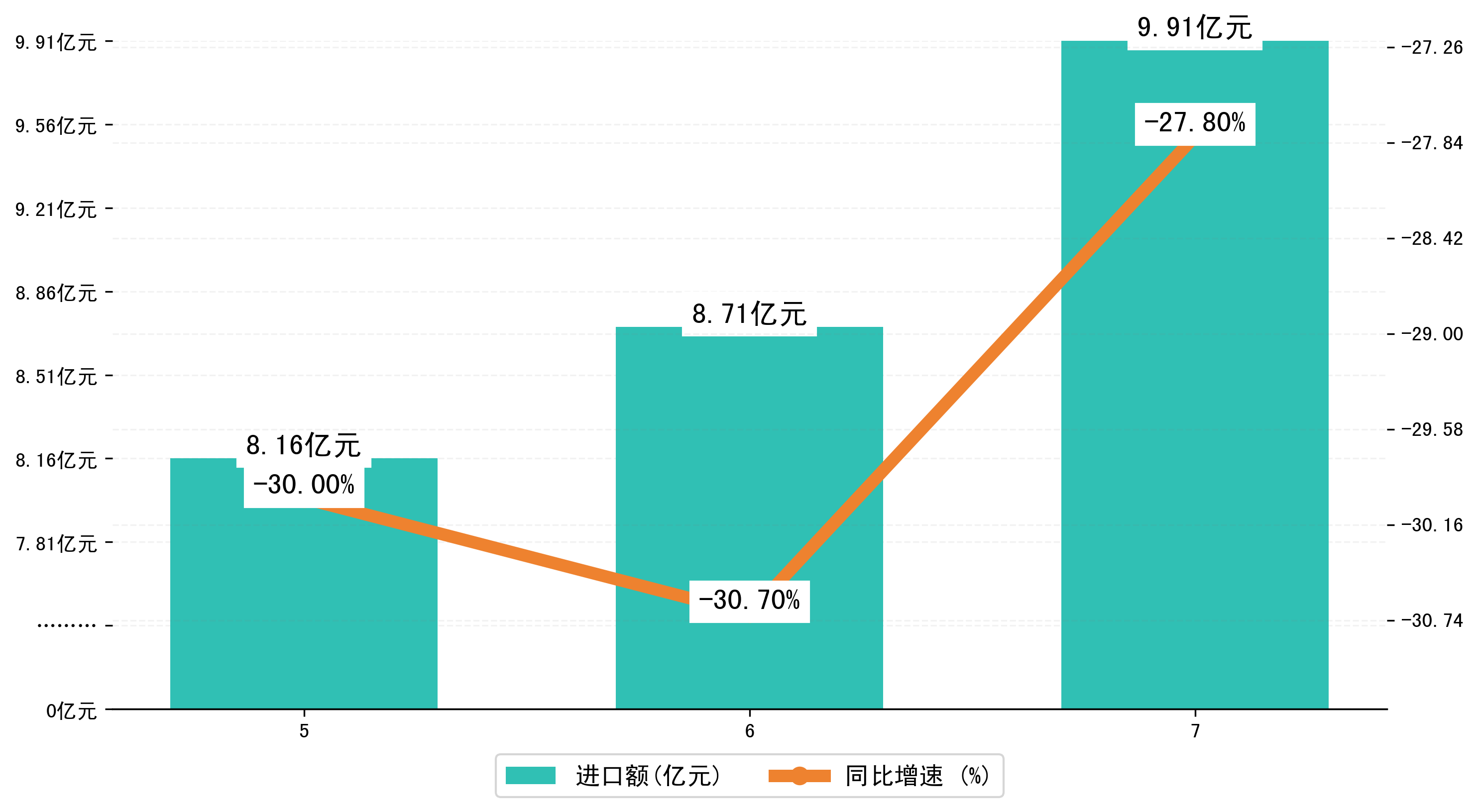 以美元计,2025年1-7月衡阳市进口额为10,1959.0885万美元,相比上年同期减少了3,8298.9076万美元,同比减少-28.60%。