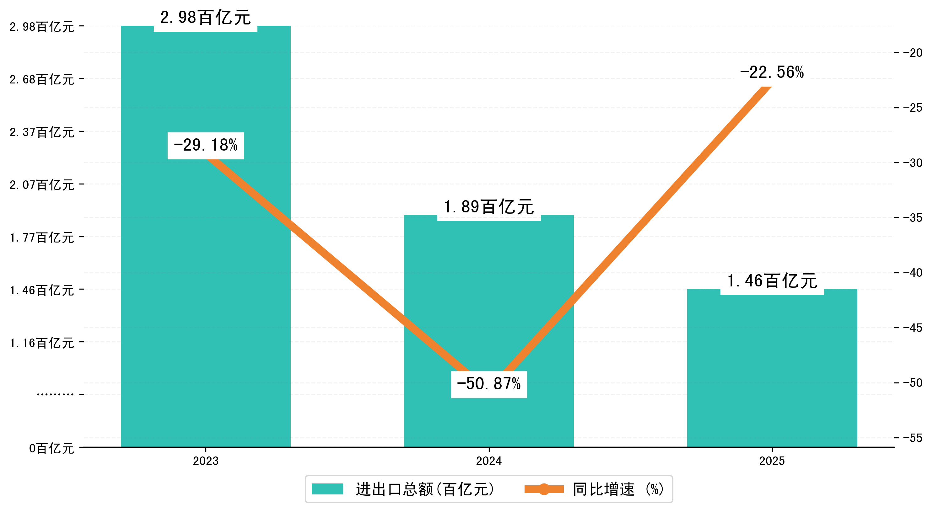 以人民币计,2025年1-7月衡阳市进出口总额为146,3960.0289万元,相比上年同期减少了42,6426.9613万元,同比减少了-23.30%。