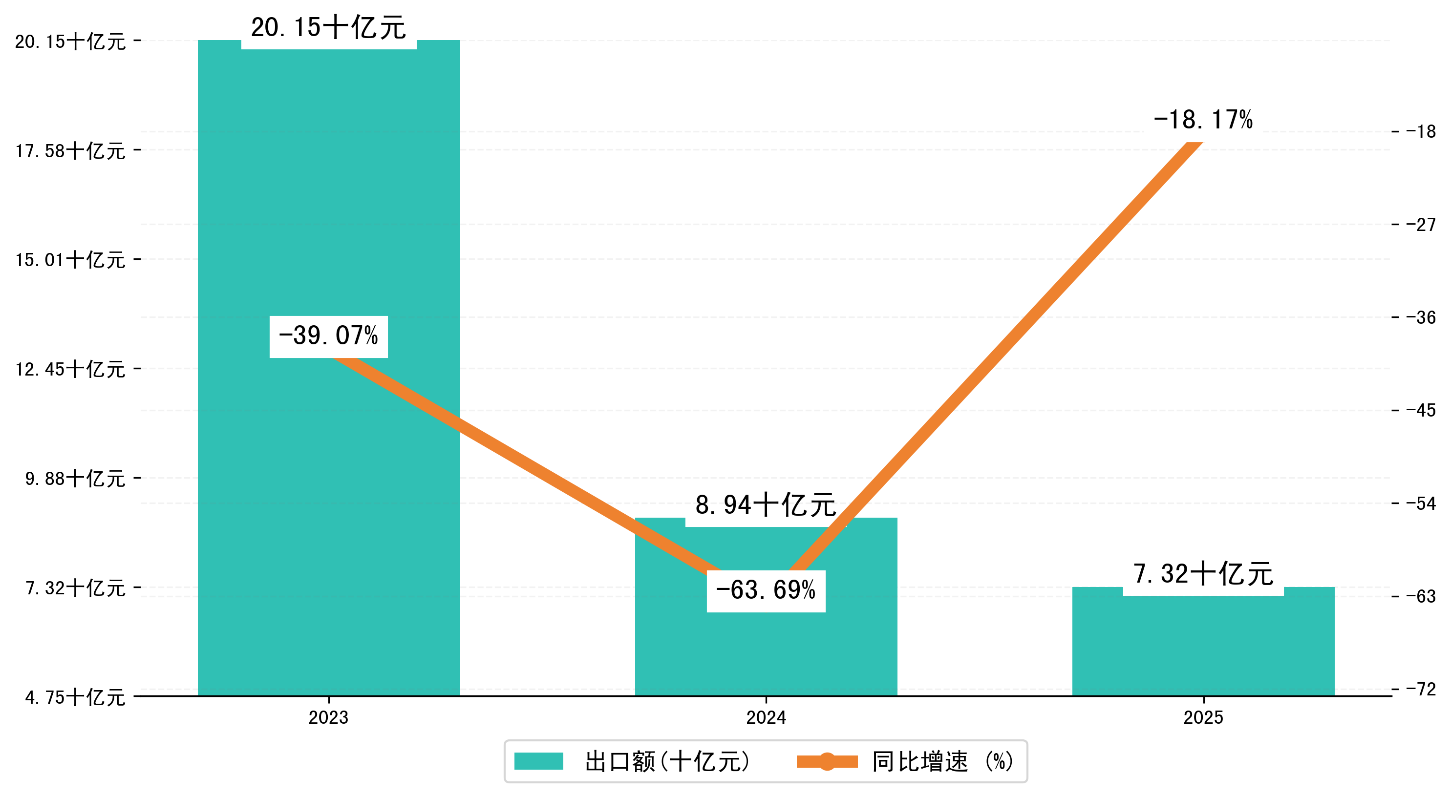 以人民币计,2025年1-7月衡阳市出口额为73,1511.8532万元,相比上年同期减少了16,2388.1441万元,同比减少了-18.20%。