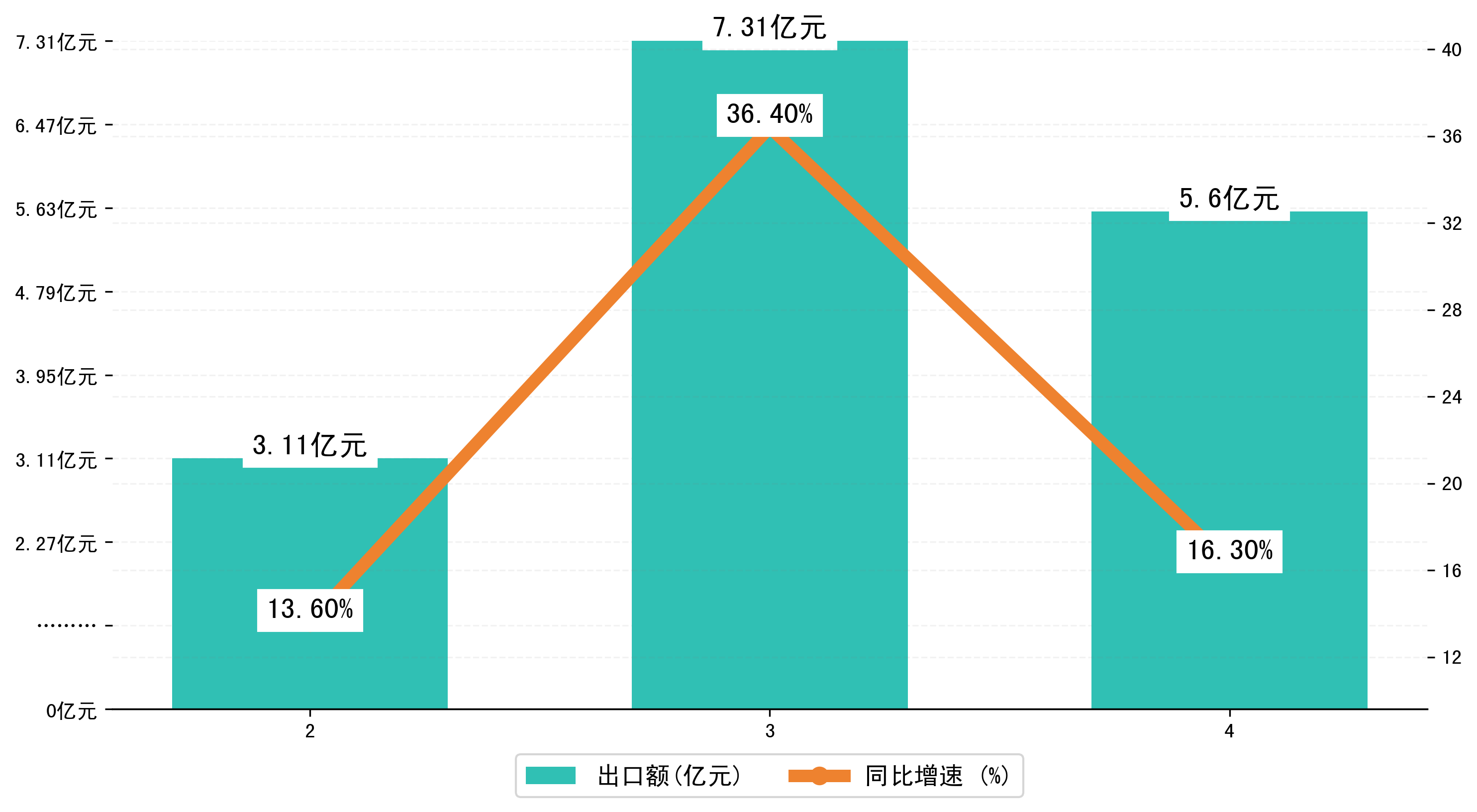 以人民币计,2024年1-4月淮南市出口额为23,4316.6885万元,相比上年同期减少了3,9647.7826万元,同比增加了16.30%。