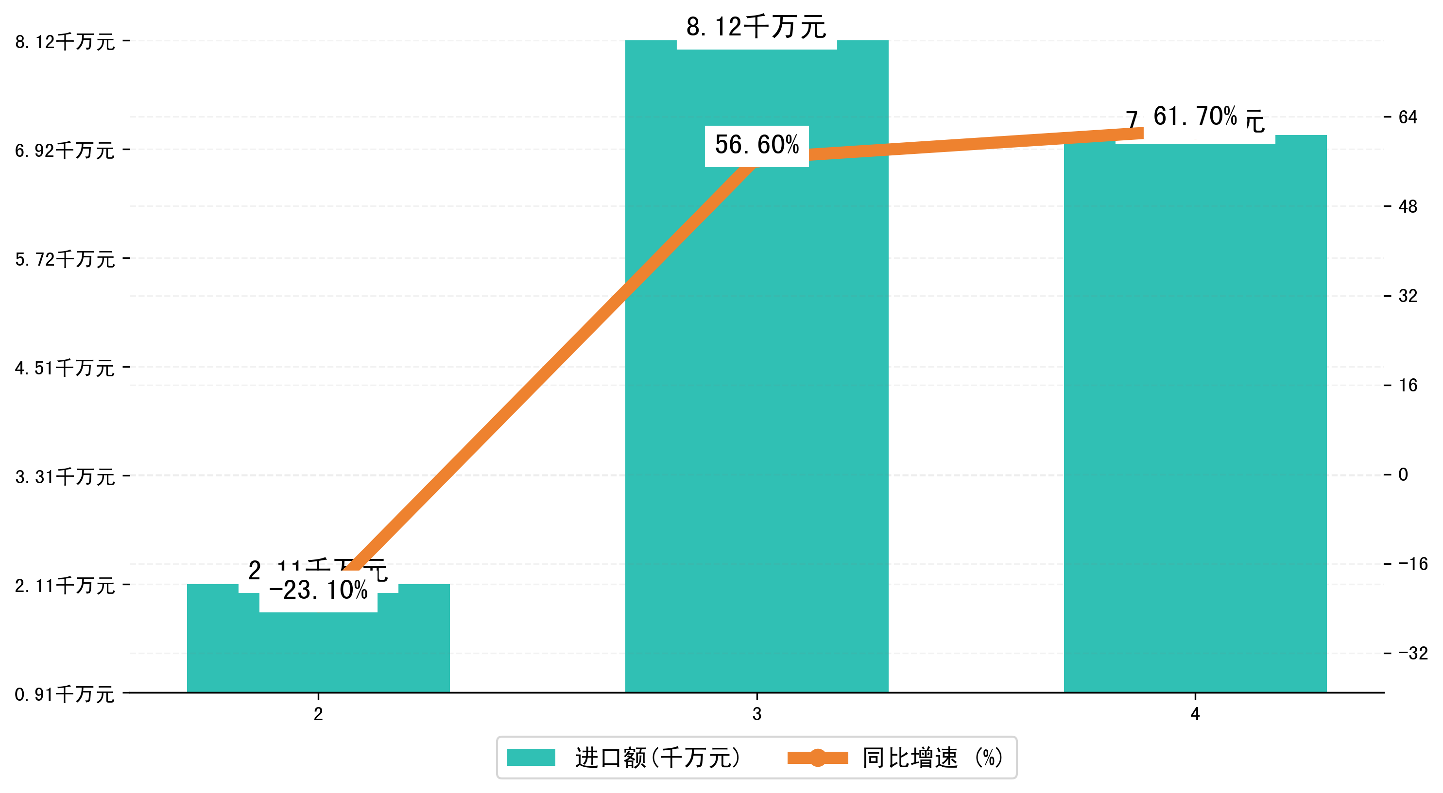 以人民币计,2024年1-4月淮南市进口额为1,8473.024万元,相比上年同期增加了7047.4257万元,同比增加了61.70%。