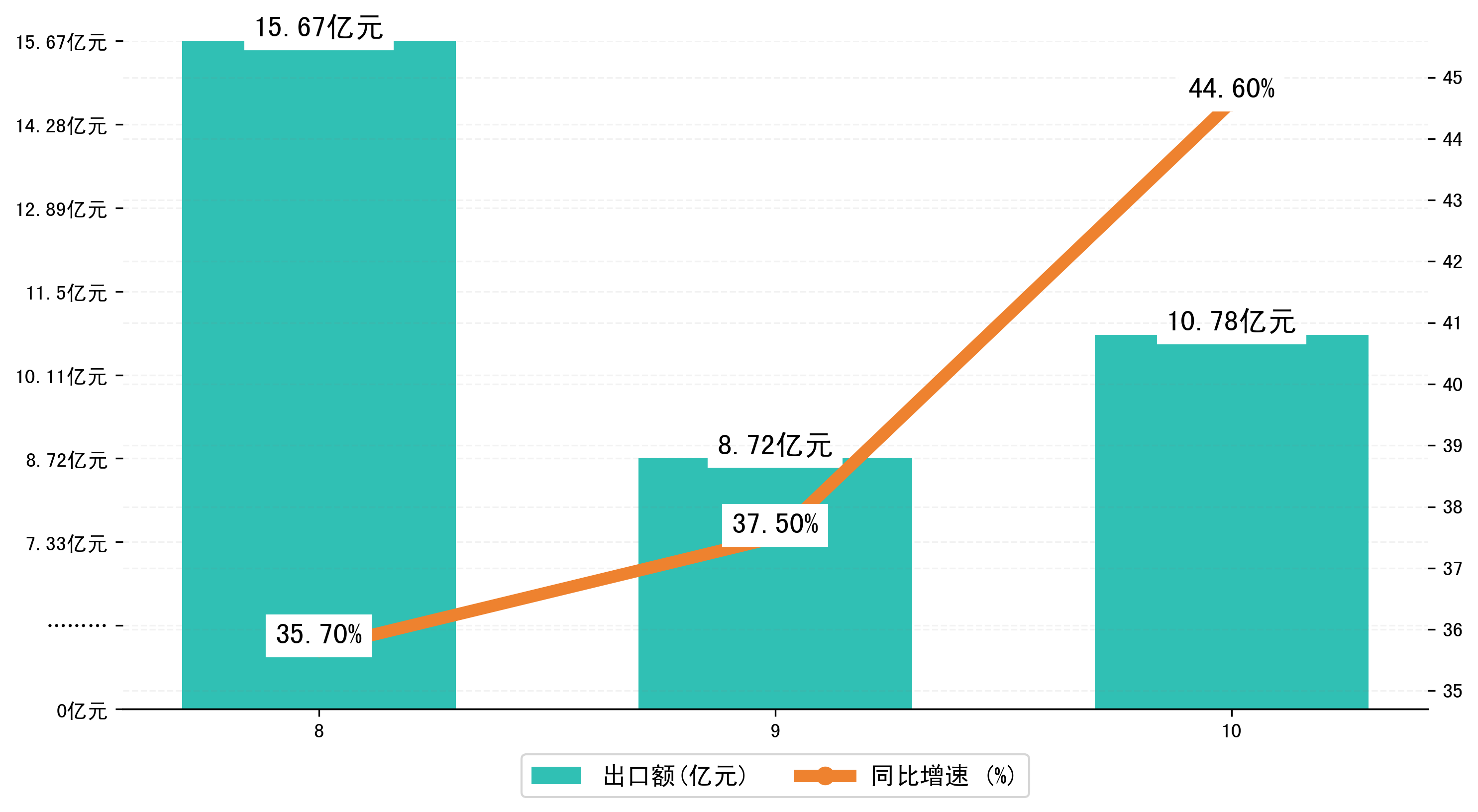 以美元计,2023年10月淮南市出口额为1,5014.8927万美元,相比上月增加了2890.0425万美元;相比上年同期增加了8756.5538万美元,同比增加34.40%。