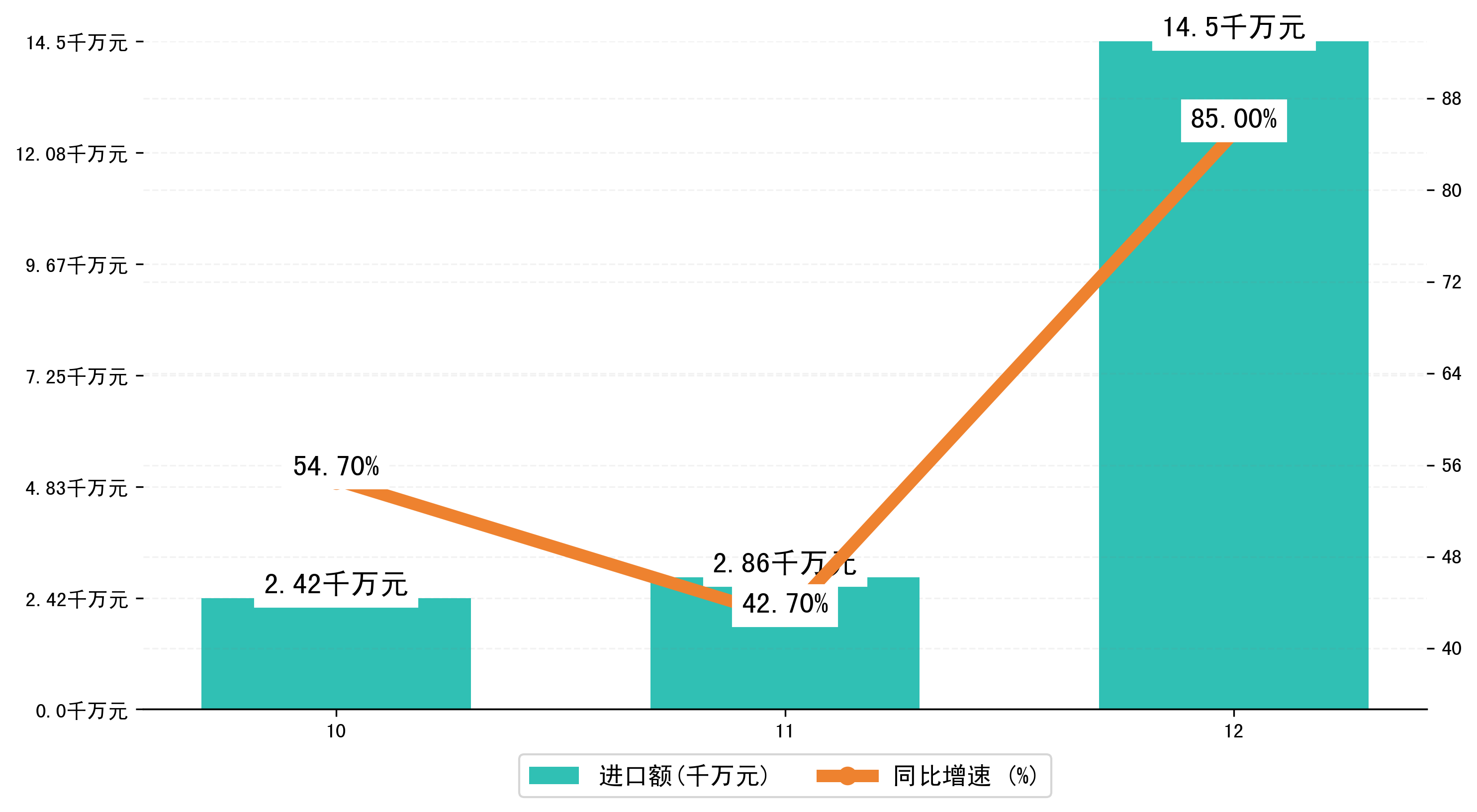 以人民币计,2023年12月淮南市进口额为1,4500.189万元,相比上月增加了1,1635.7034万元;相比上年同期增加了1,1347.2131万元,同比增加了85.00%。