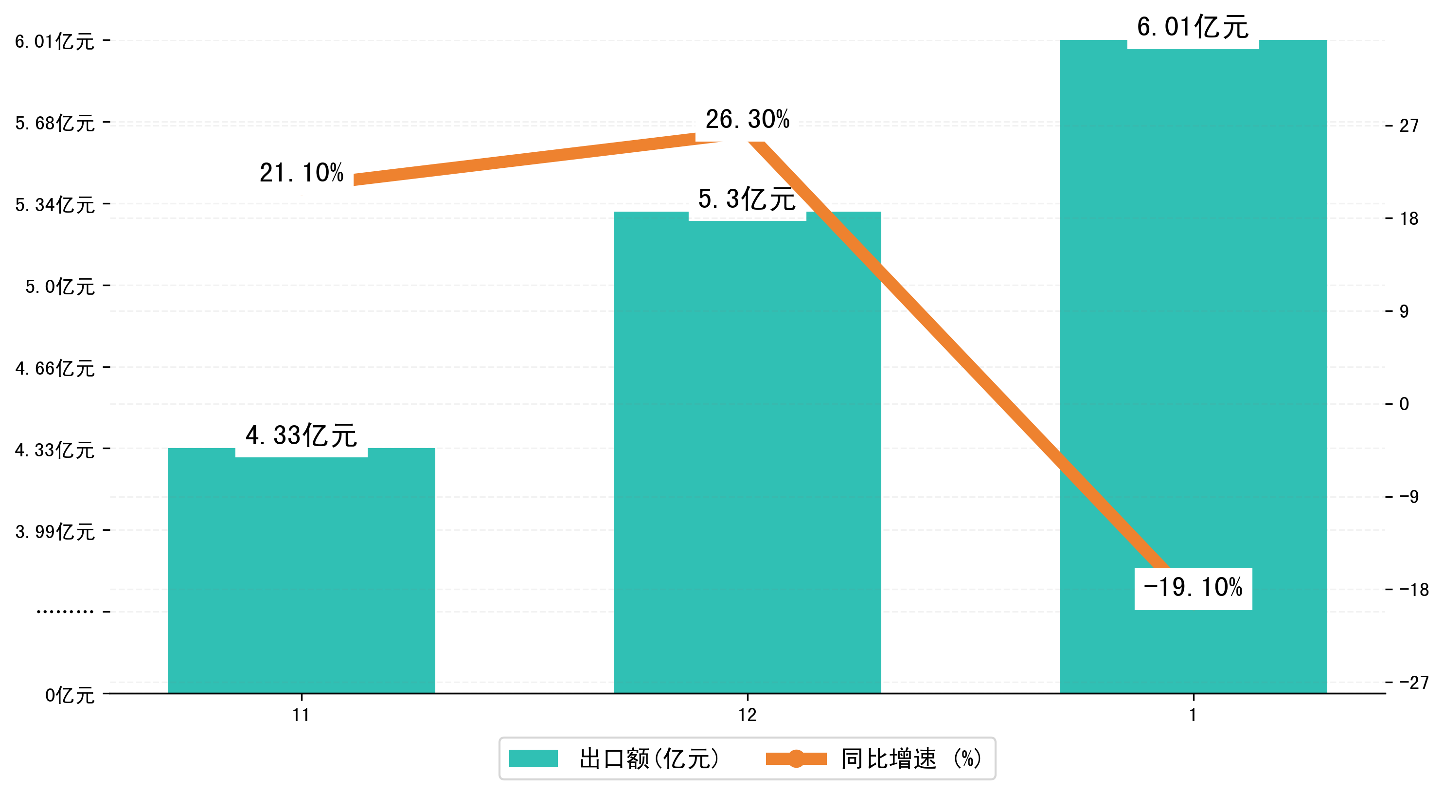 以人民币计,2023年1-1月淮南市出口额为6,0131.0713万元,相比上年同期减少了1,4226.3254万元,同比减少了-19.10%。