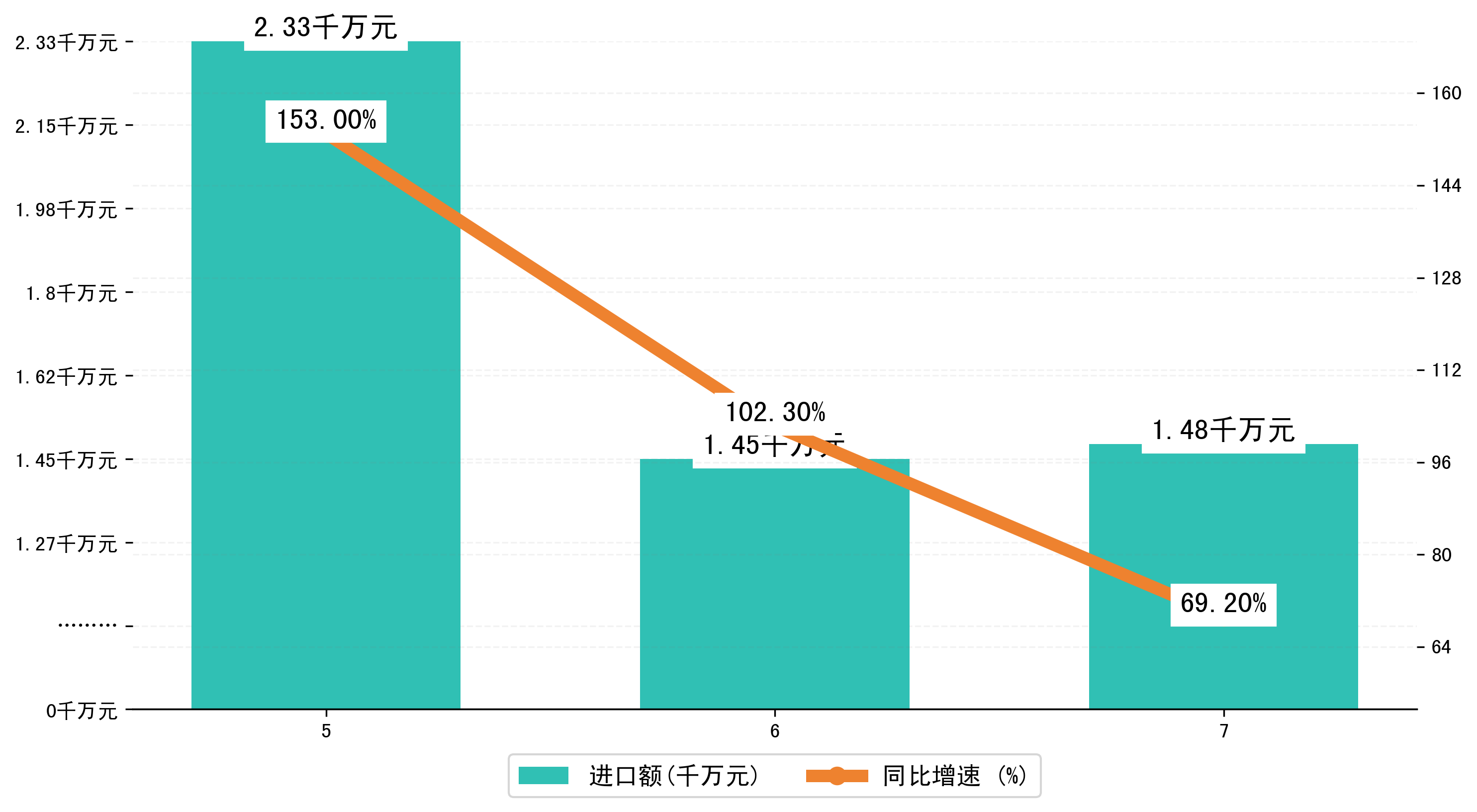 以人民币计,2023年7月淮南市进口额为1477.7596万元,相比上月增加了31.2516万元;相比上年同期减少了867.8206万元,同比增加了69.20%。