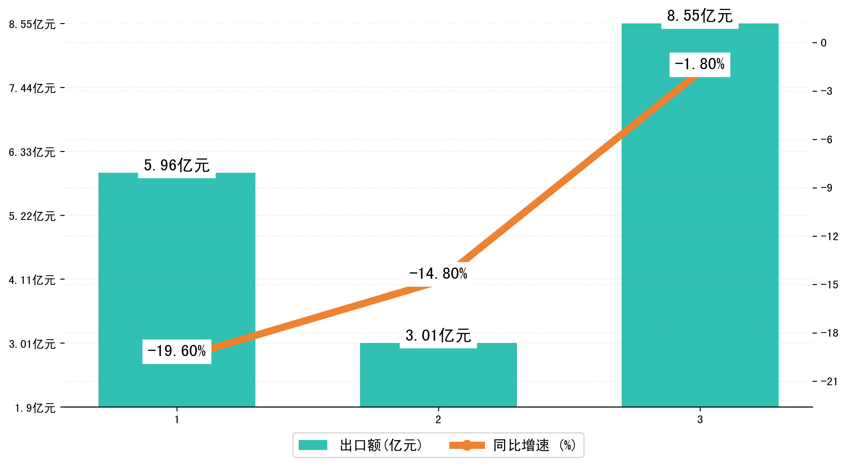 以人民币计,2025年1-3月淮南市出口额为17,5079.1852万元,相比上年同期减少了3278.5158万元,同比减少了-1.80%。