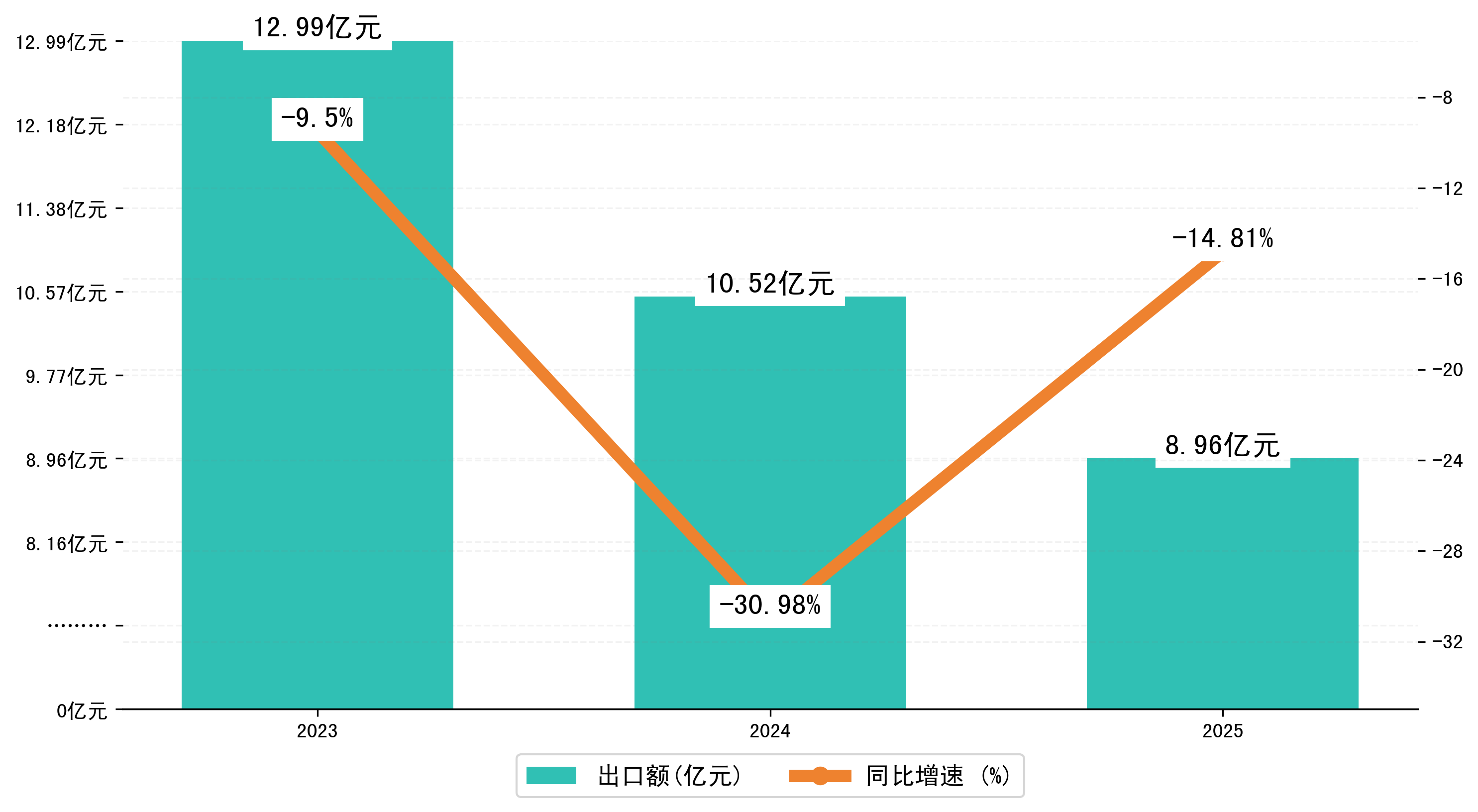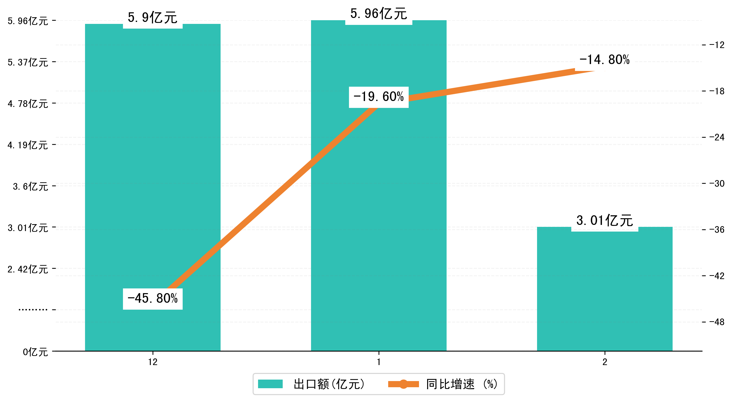 以美元计,2025年1-2月淮南市出口额为1,2473.6924万美元,相比上年同期减少了2340.2106万美元,同比减少-15.80%。