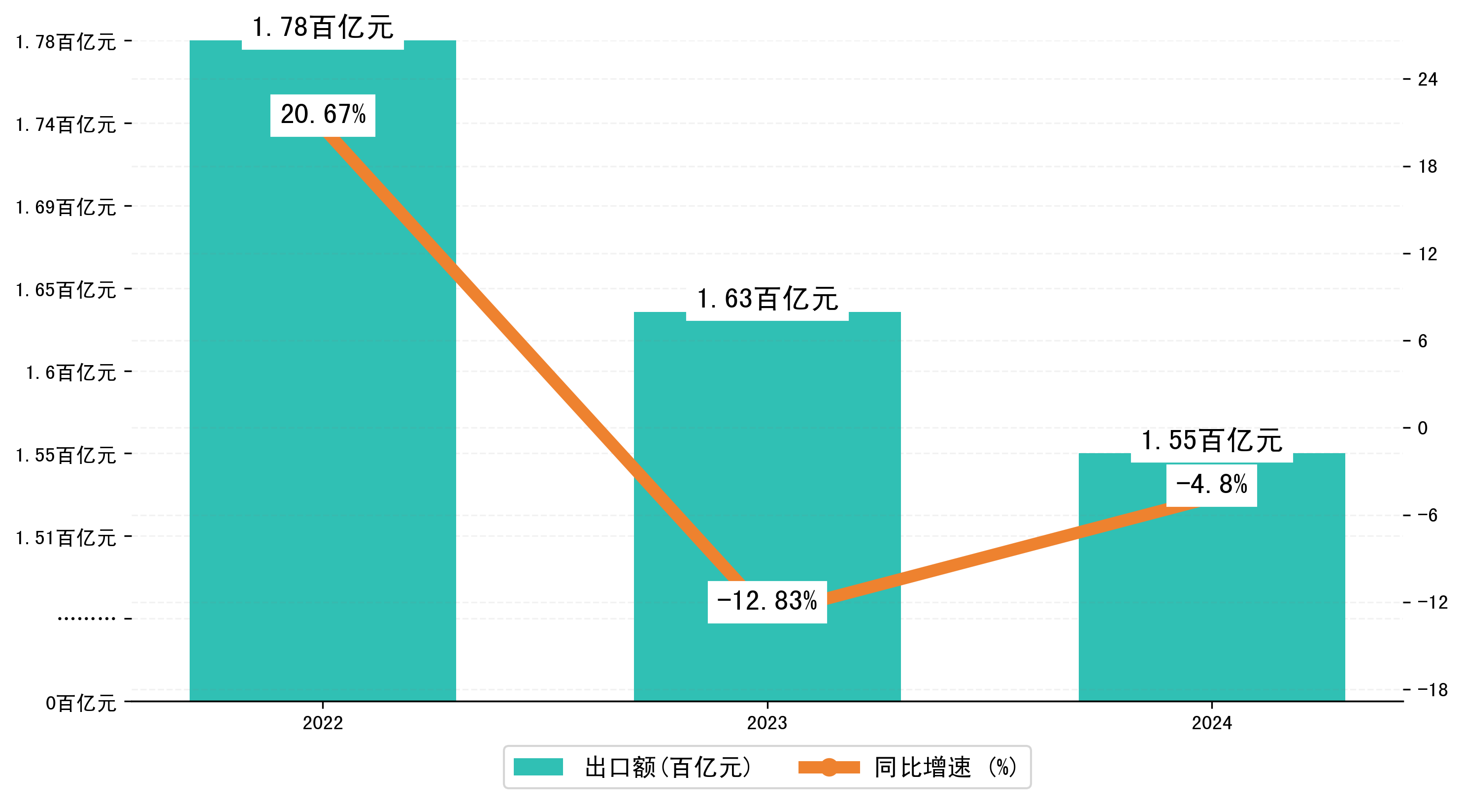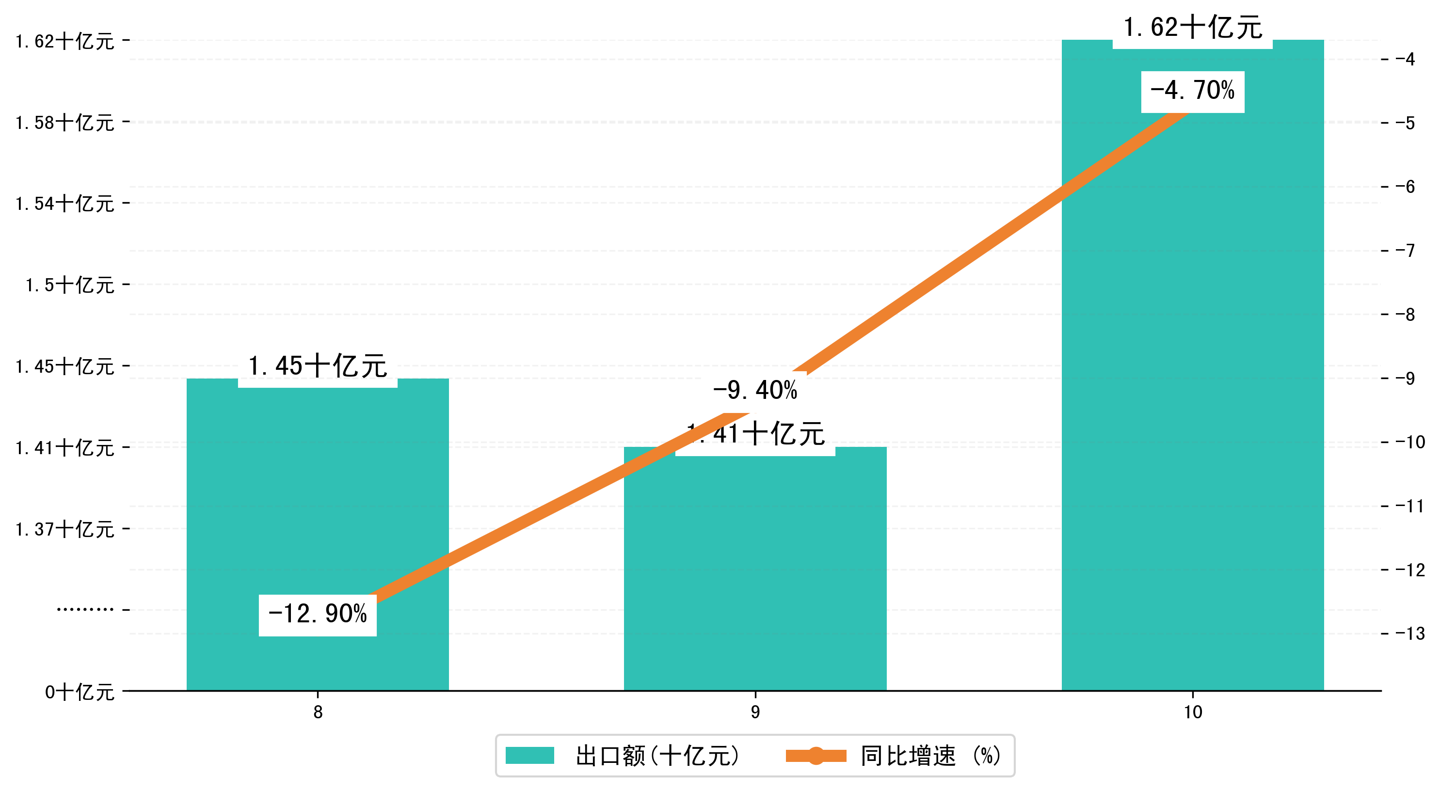 以人民币计,2024年1-10月黄石市出口额为155,4788.5949万元,相比上年同期减少了7,8441.9968万元,同比减少了-4.70%。