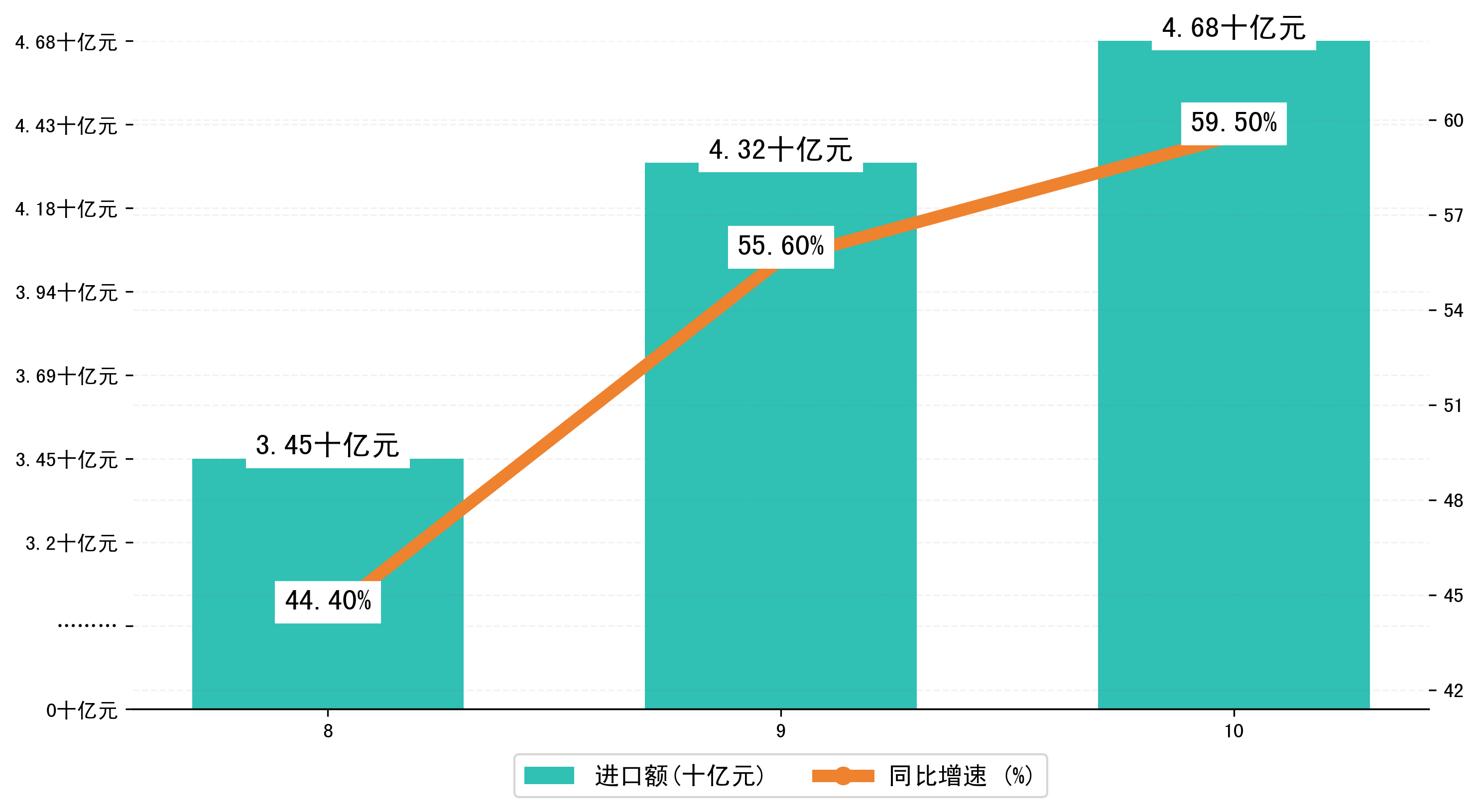 以人民币计,2024年10月黄石市进口额为46,7665.9833万元,相比上月增加了3,5917.6856万元;相比上年同期增加了19,4875.0877万元,同比增加了59.50%。