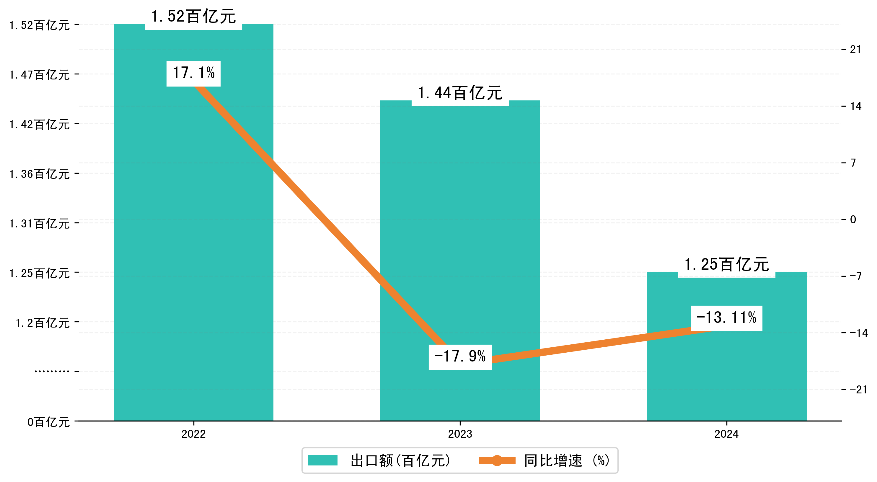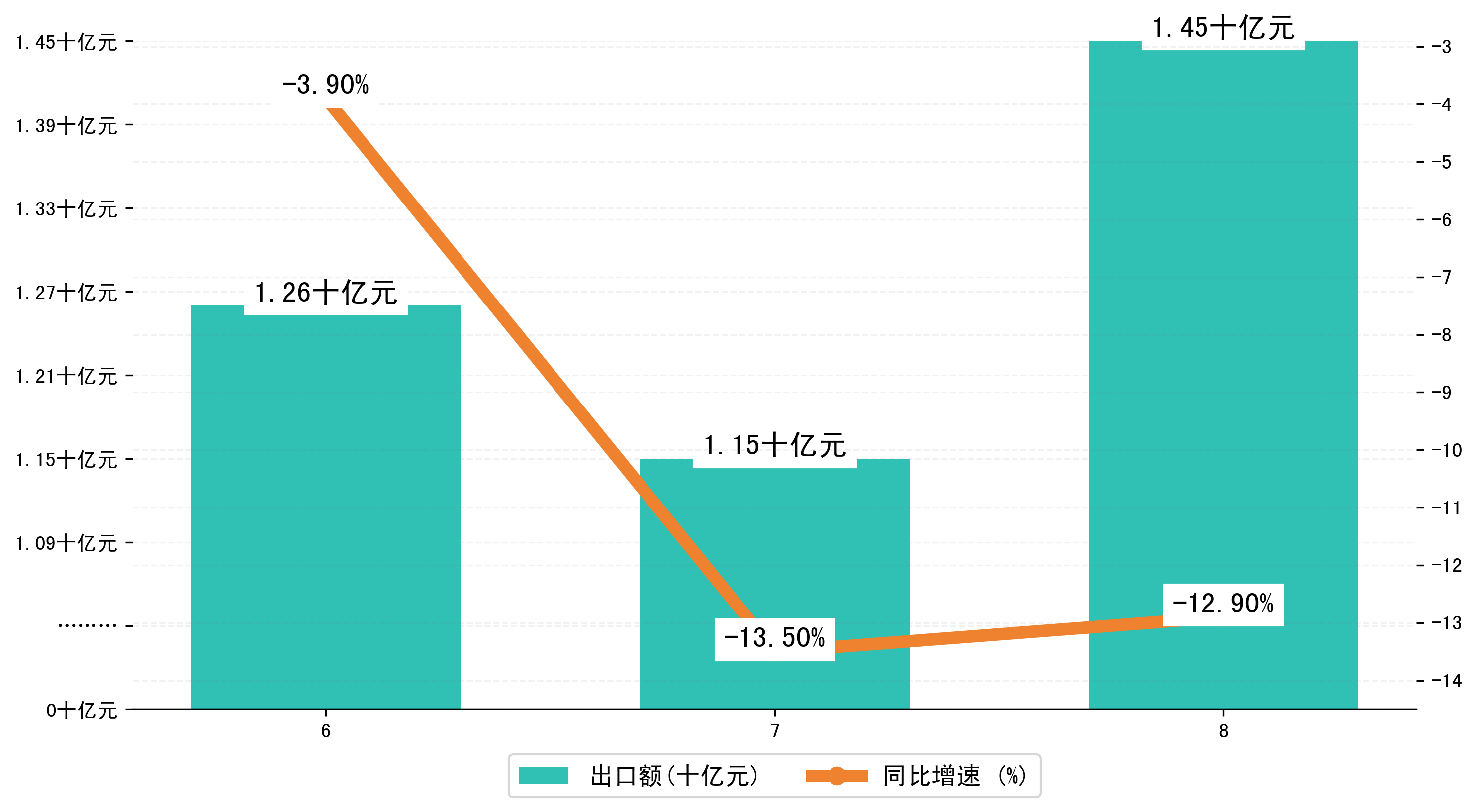 以人民币计,2024年1-8月黄石市出口额为125,1399.424万元,相比上年同期减少了18,8809.2242万元,同比减少了-12.90%。