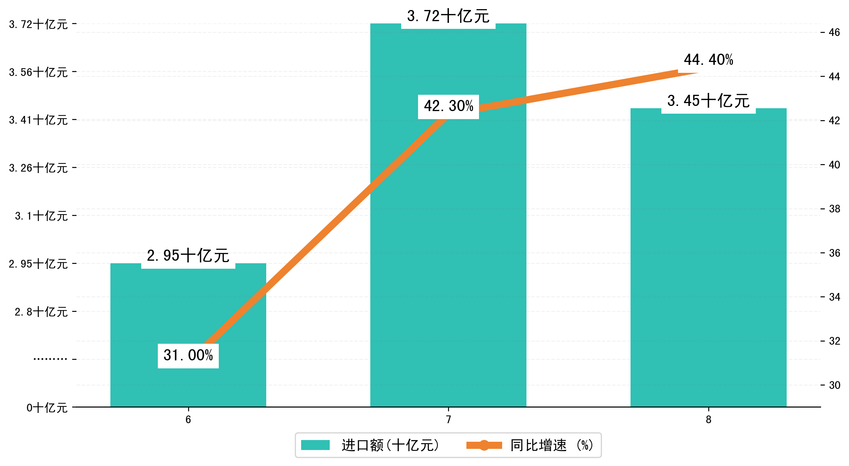 以人民币计,2024年8月黄石市进口额为34,4569.6121万元,相比上月减少了2,7184.4448万元;相比上年同期增加了11,1905.9616万元,同比增加了44.40%。