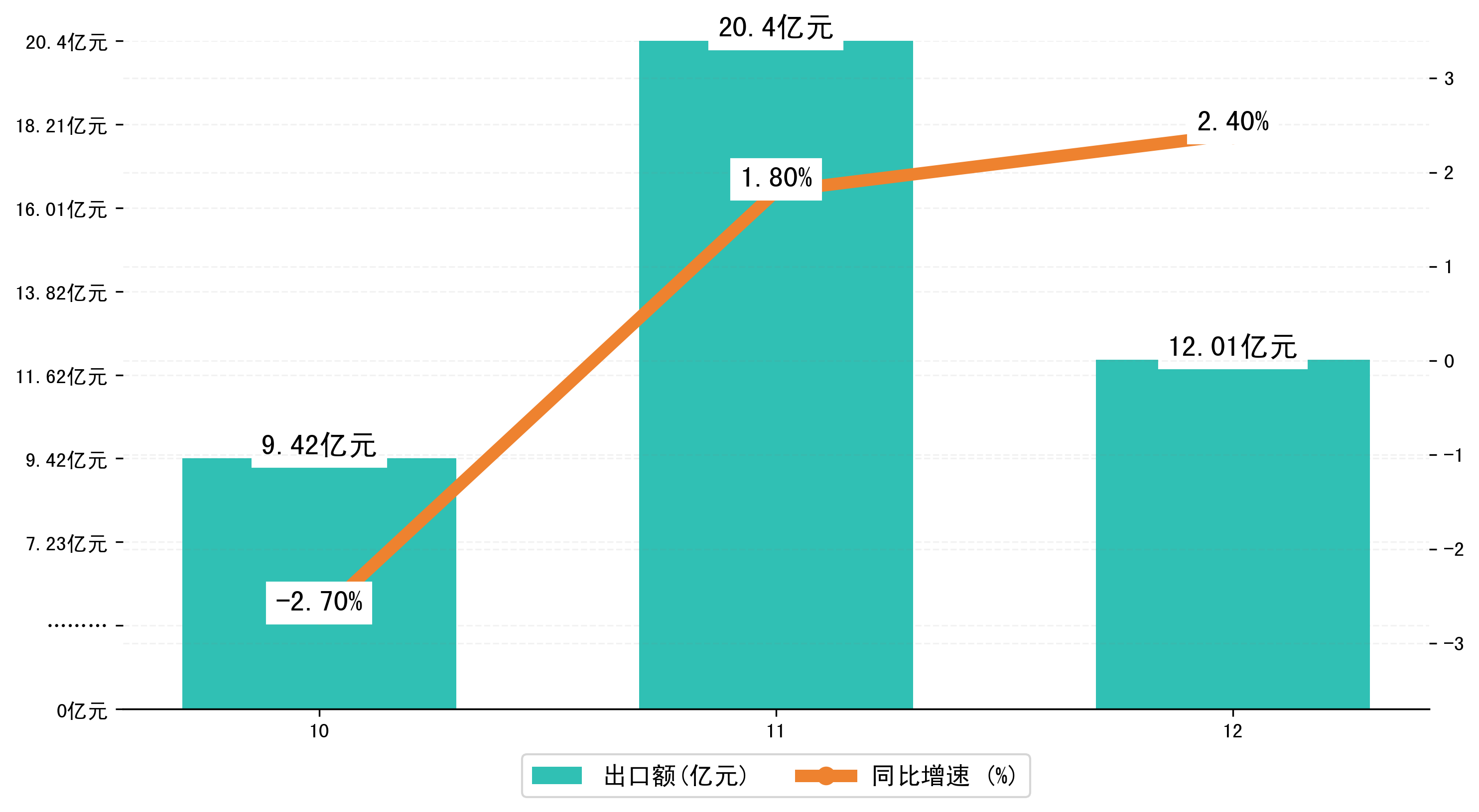 以人民币计,2023年12月黄石市出口额为12,0122.2201万元,相比上月减少了8,3911.3288万元;相比上年同期增加了1,4009.3413万元,同比增加了2.40%。