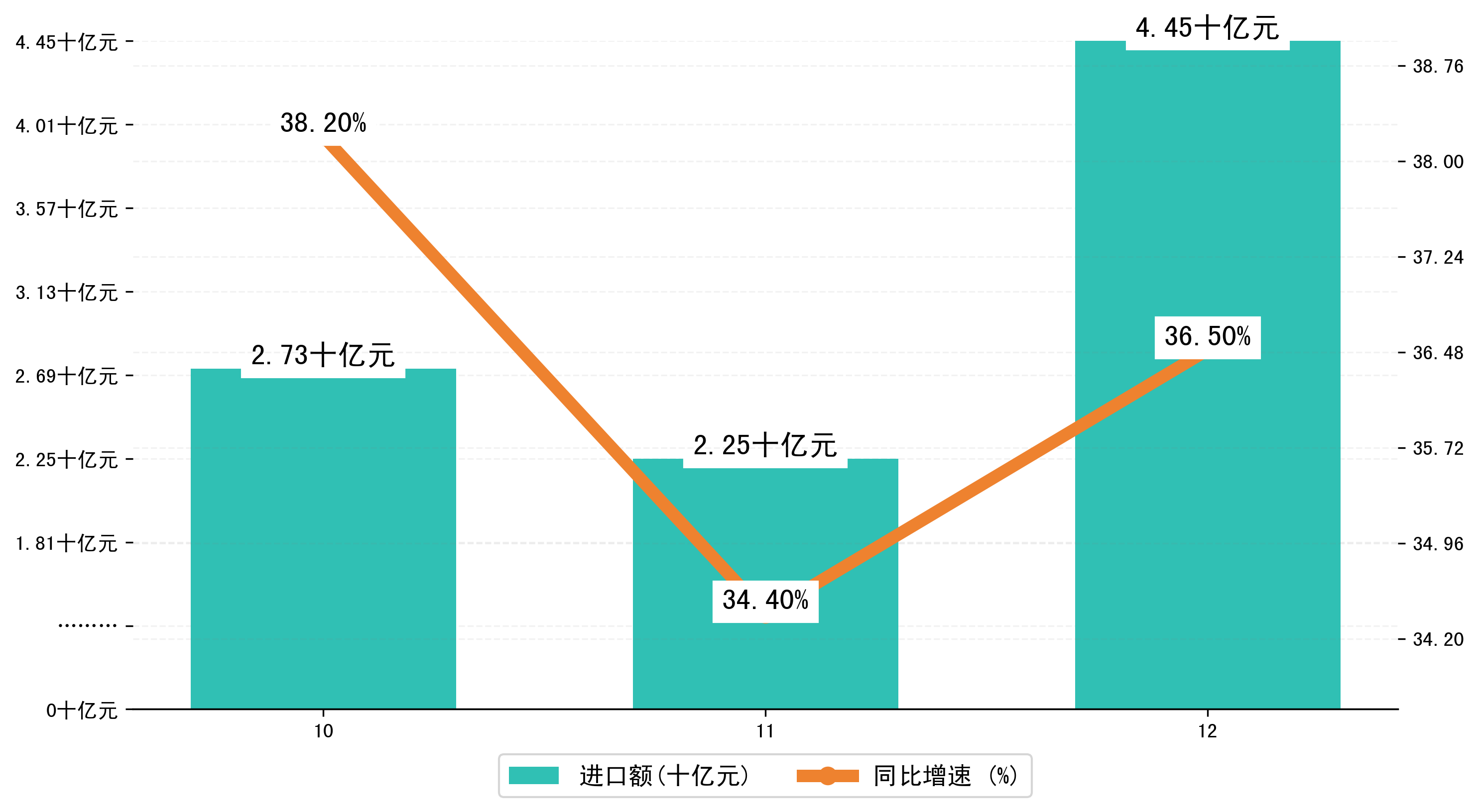 以人民币计,2023年12月黄石市进口额为44,5373.3006万元,相比上月增加了22,0001.5588万元;相比上年同期增加了17,7546.5325万元,同比增加了36.50%。