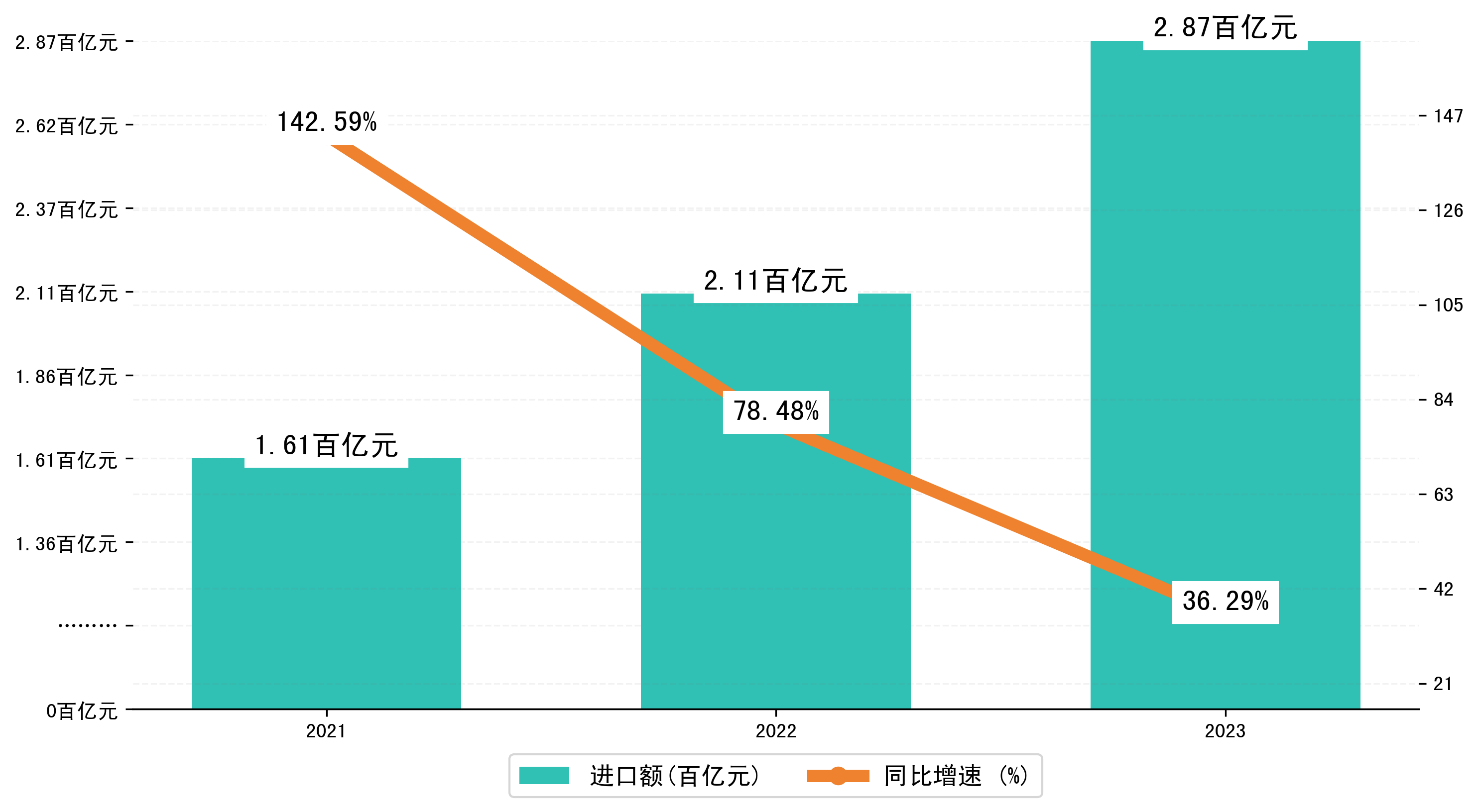 以人民币计,2023年1-12月黄石市进口额为287,1235.7286万元,相比上年同期增加了76,4491.3355万元,同比增加了36.50%。