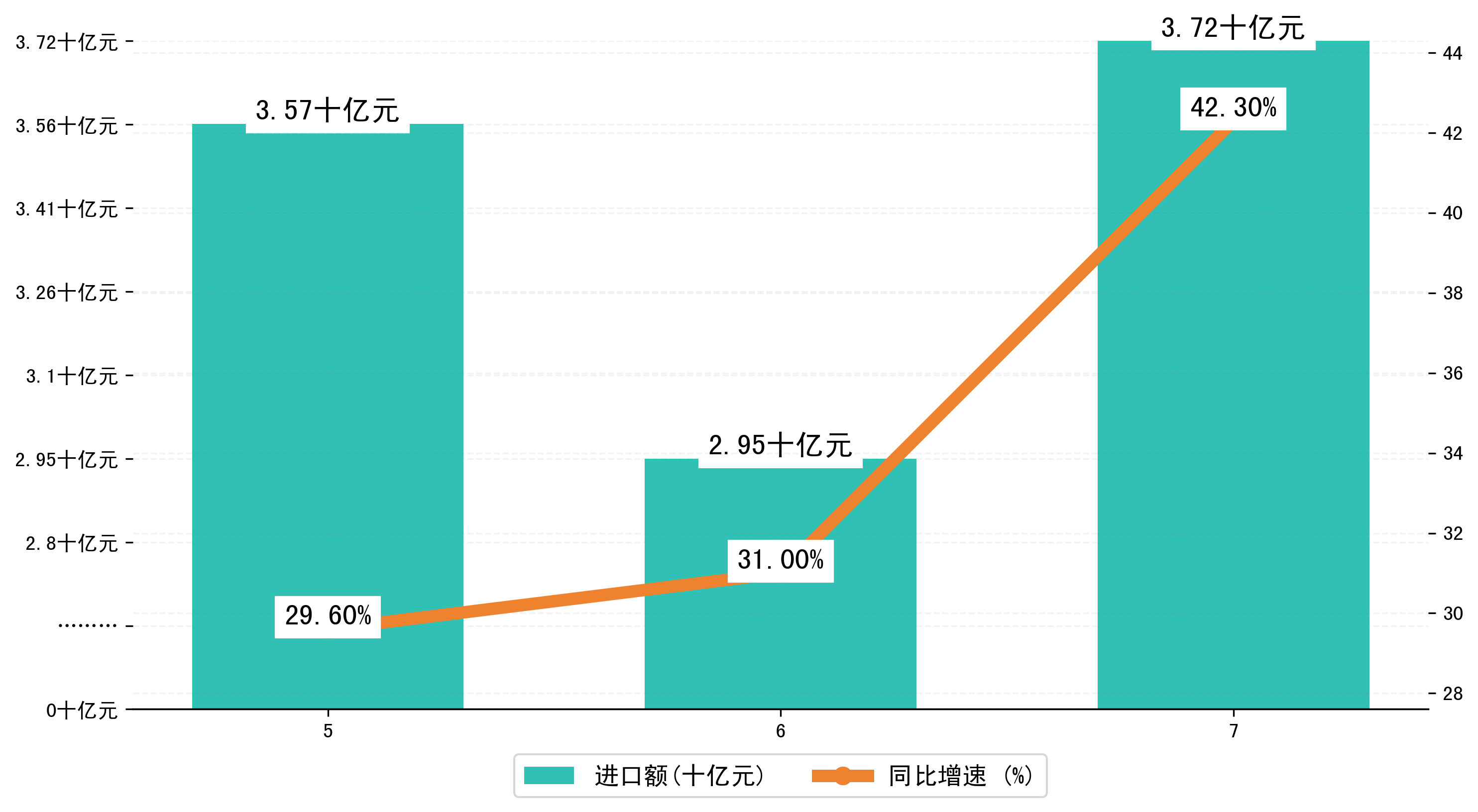 以人民币计,2024年7月黄石市进口额为37,1754.0569万元,相比上月增加了7,6741.7867万元;相比上年同期增加了20,8665.3583万元,同比增加了42.30%。