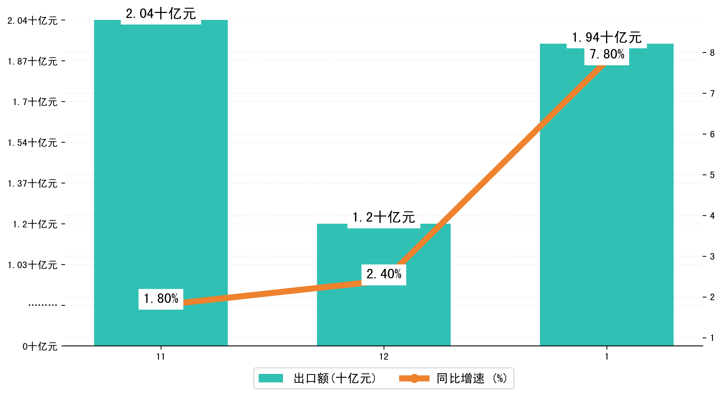 以人民币计,2024年1-1月黄石市出口额为19,4227.7079万元,相比上年同期增加了1,4065.079万元,同比增加了7.80%。
