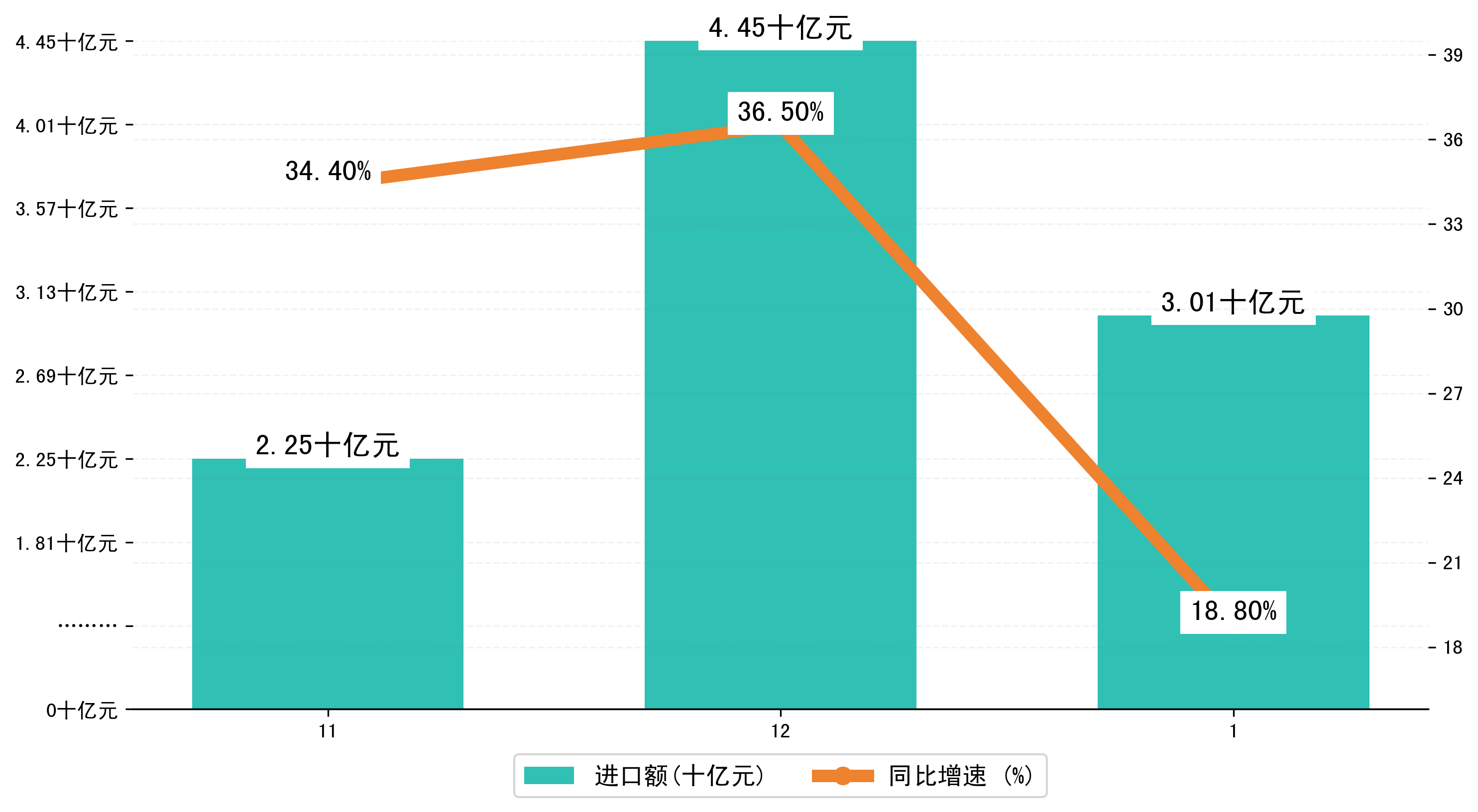 以人民币计,2024年1-1月黄石市进口额为30,0648.3756万元,相比上年同期增加了7,2270.1549万元,同比增加了18.80%。