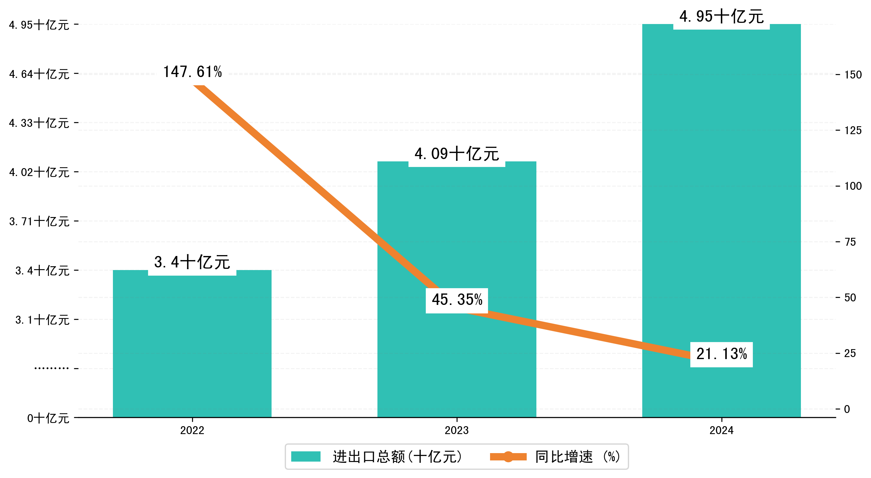 以人民币计,2024年1-1月黄石市进出口总额为49,4876.0836万元,相比上年同期增加了8,6335.2339万元,同比增加了14.20%。