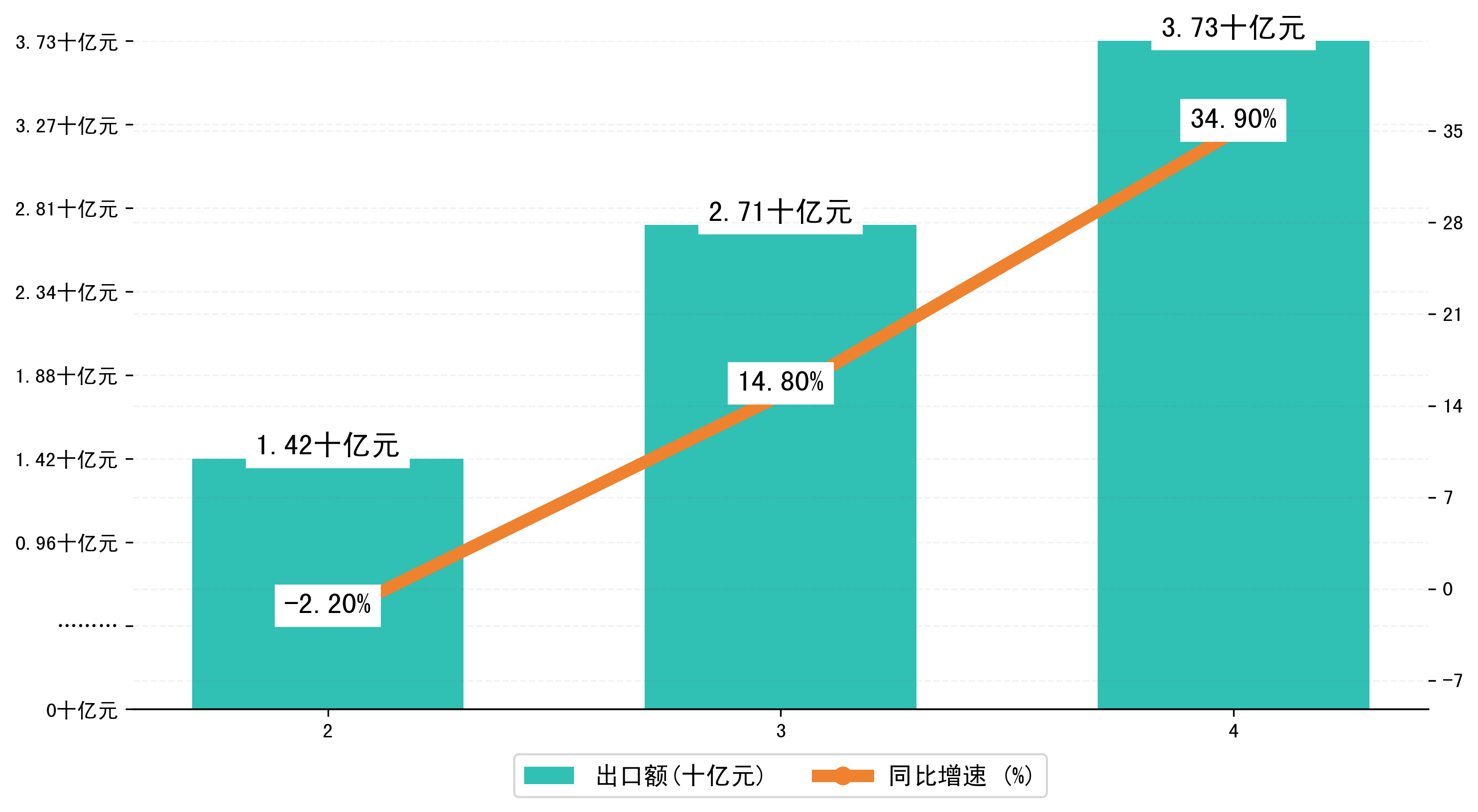 以人民币计,2025年1-4月黄石市出口额为97,2753.9152万元,相比上年同期增加了20,3625.6967万元,同比增加了34.90%。