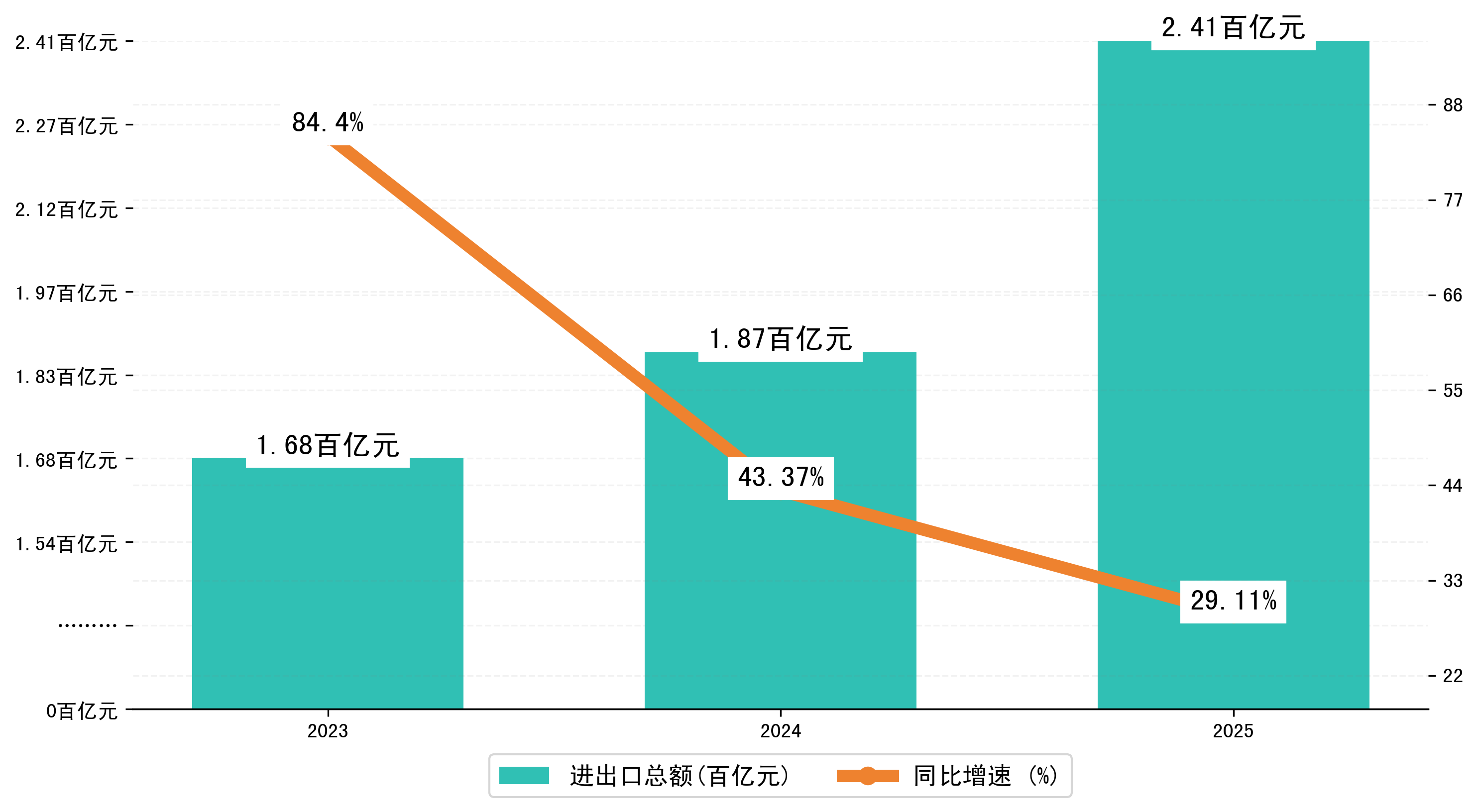 以人民币计,2025年1-4月黄石市进出口总额为241,1895.3238万元,相比上年同期增加了54,3781.1816万元,同比增加了25.10%。