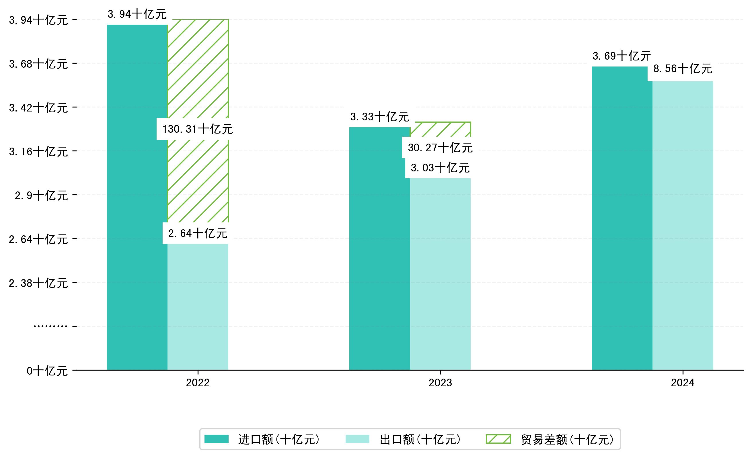 以美元计,2024年4月呼和浩特市贸易差额为9395,6544万美元(贸易逆差),相比上月减少了1,7396,7535万美元;相比上年同期减少了1,1816,0306万美元,同比减少-488.19%。