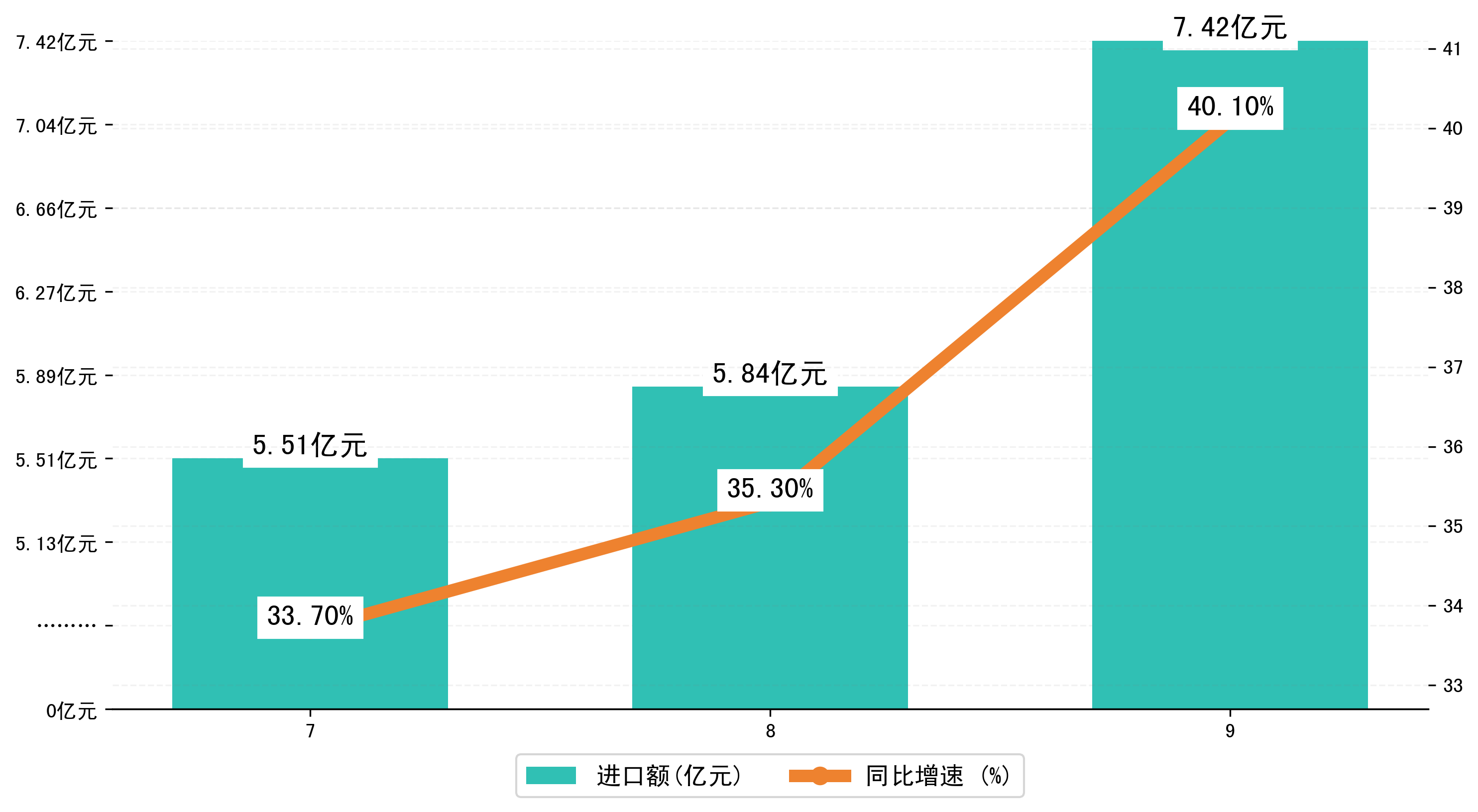 以人民币计,2024年9月呼和浩特市进口额为7,4189.834万元,相比上月增加了1,5795.2948万元;相比上年同期增加了3,9480.2064万元,同比增加了40.10%。