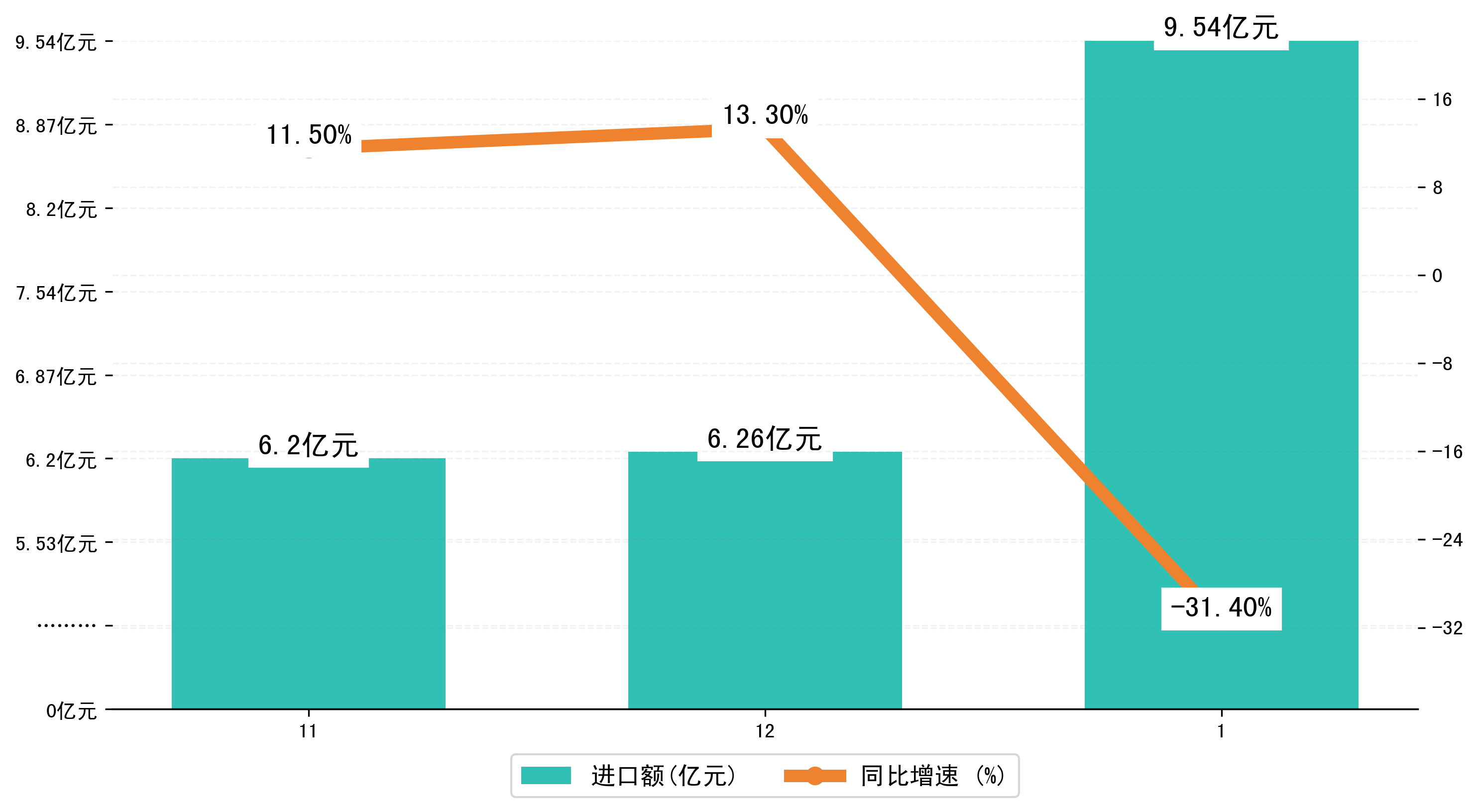 以人民币计,2023年1月呼和浩特市进口额为9,5385.6054万元,相比上月增加了3,2828.9851万元;相比上年同期减少了4,3798.7918万元,同比减少了-31.40%。