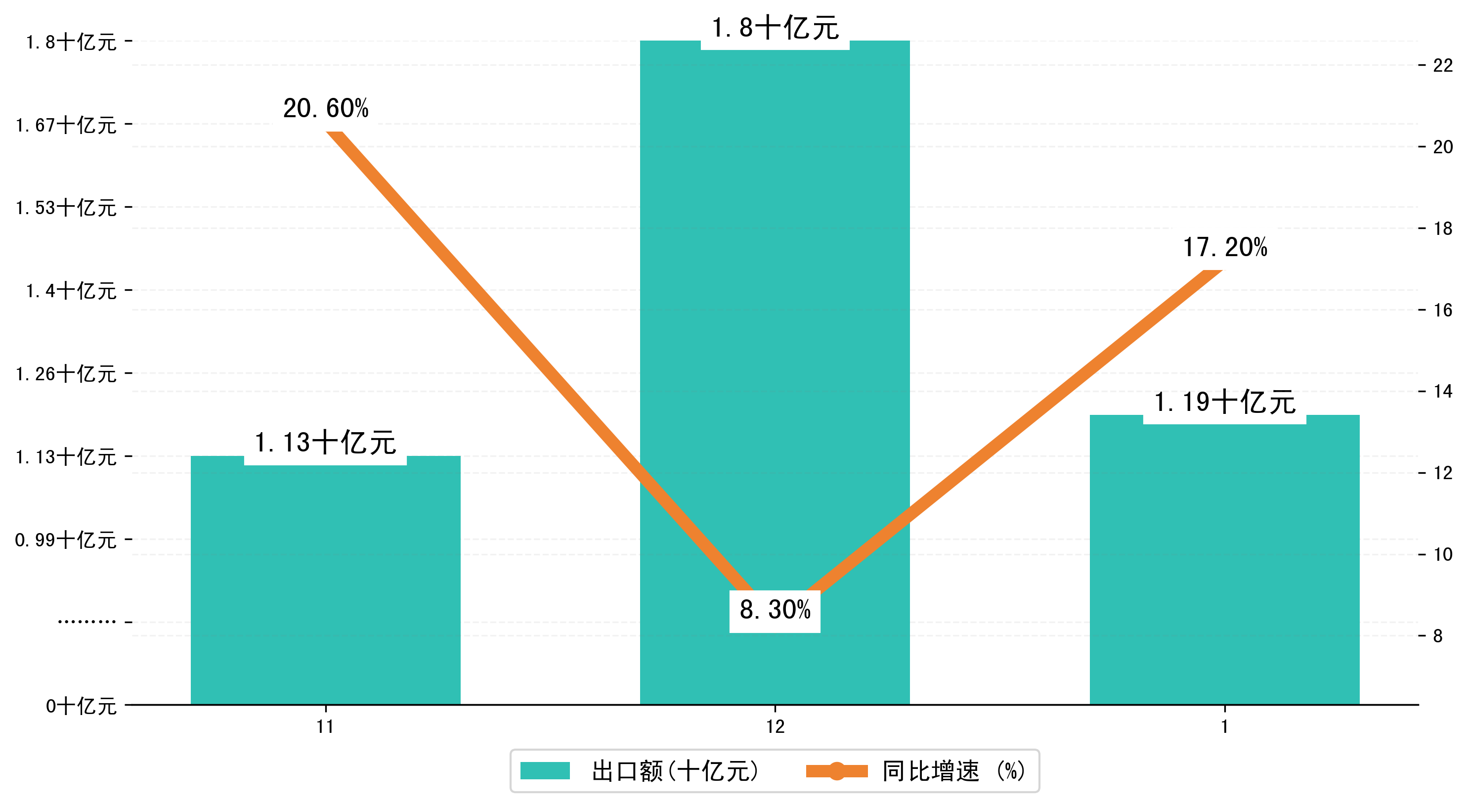 以人民币计,2025年1-1月呼和浩特市出口额为11,9160.4885万元,相比上年同期增加了1,7455.303万元,同比增加了17.20%。